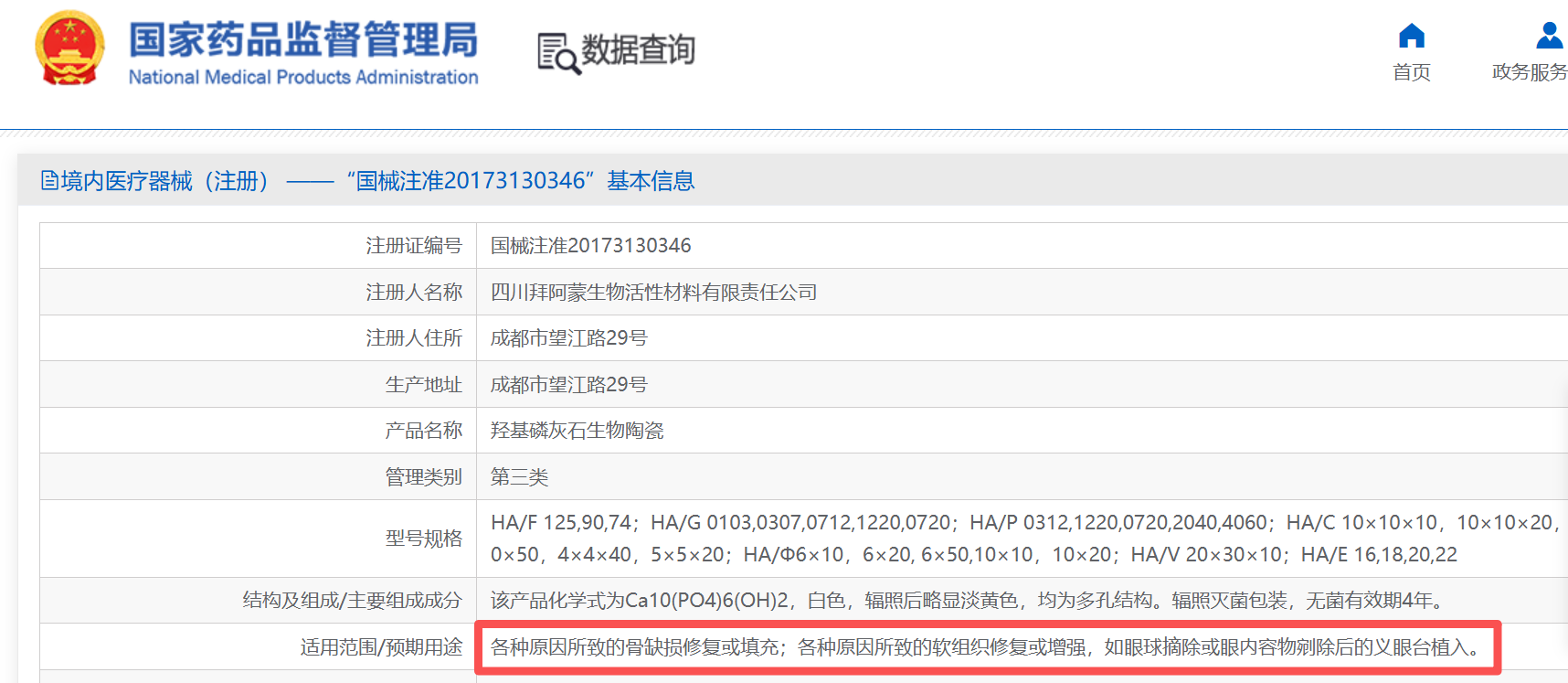 公开信息显示,菲林普利是成都睿合医药旗下的医美品牌,产品由四川拜阿蒙生物材料公司研发生产。国家药监局官网信息明确其注册全称为“羟基磷灰石生物陶瓷”,适应范围为“各种原因所致的骨缺损修复或填充;各种原因所致的软组织修复或增强,如眼球摘除或眼内容物剜除后的义眼台植入”。