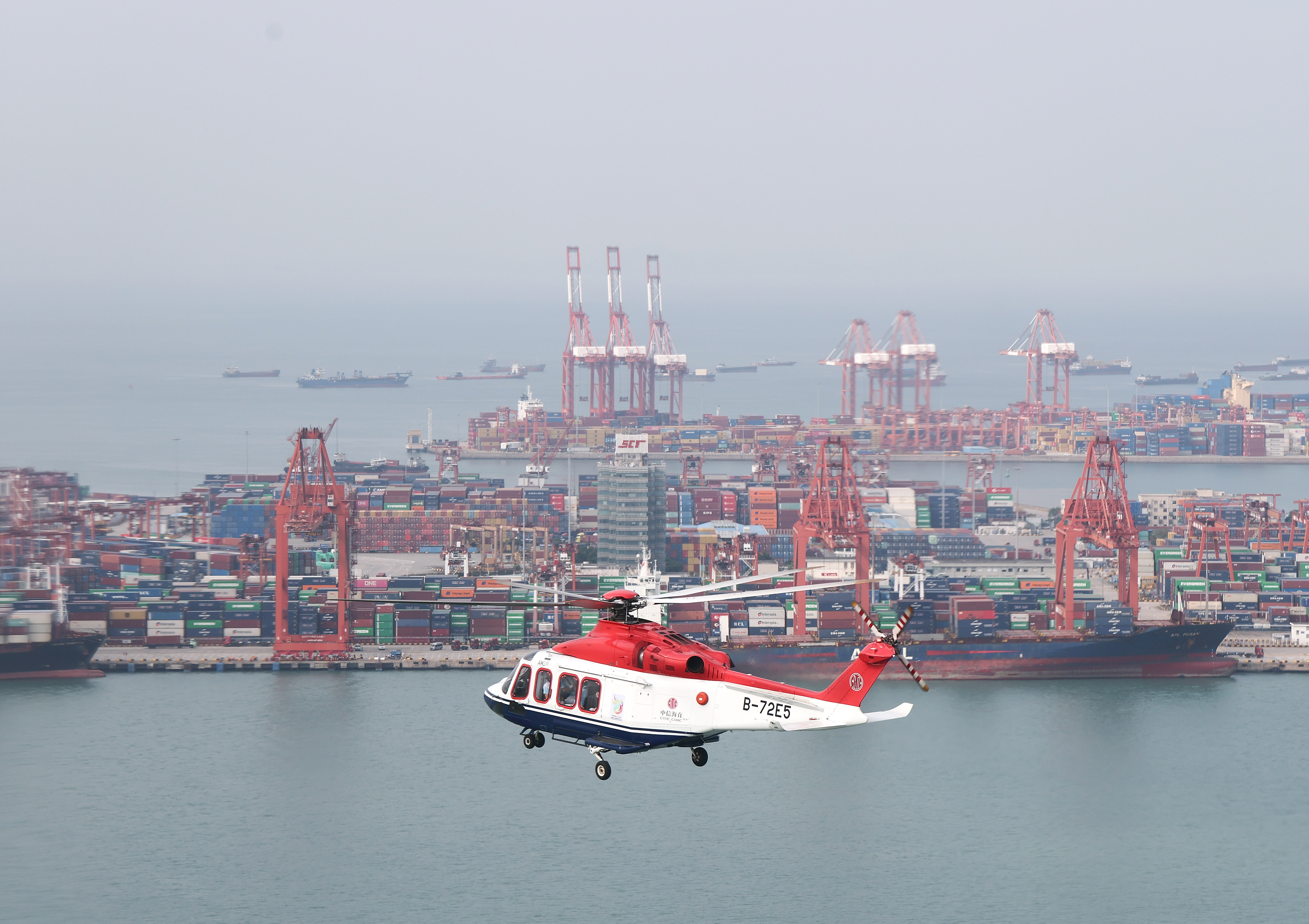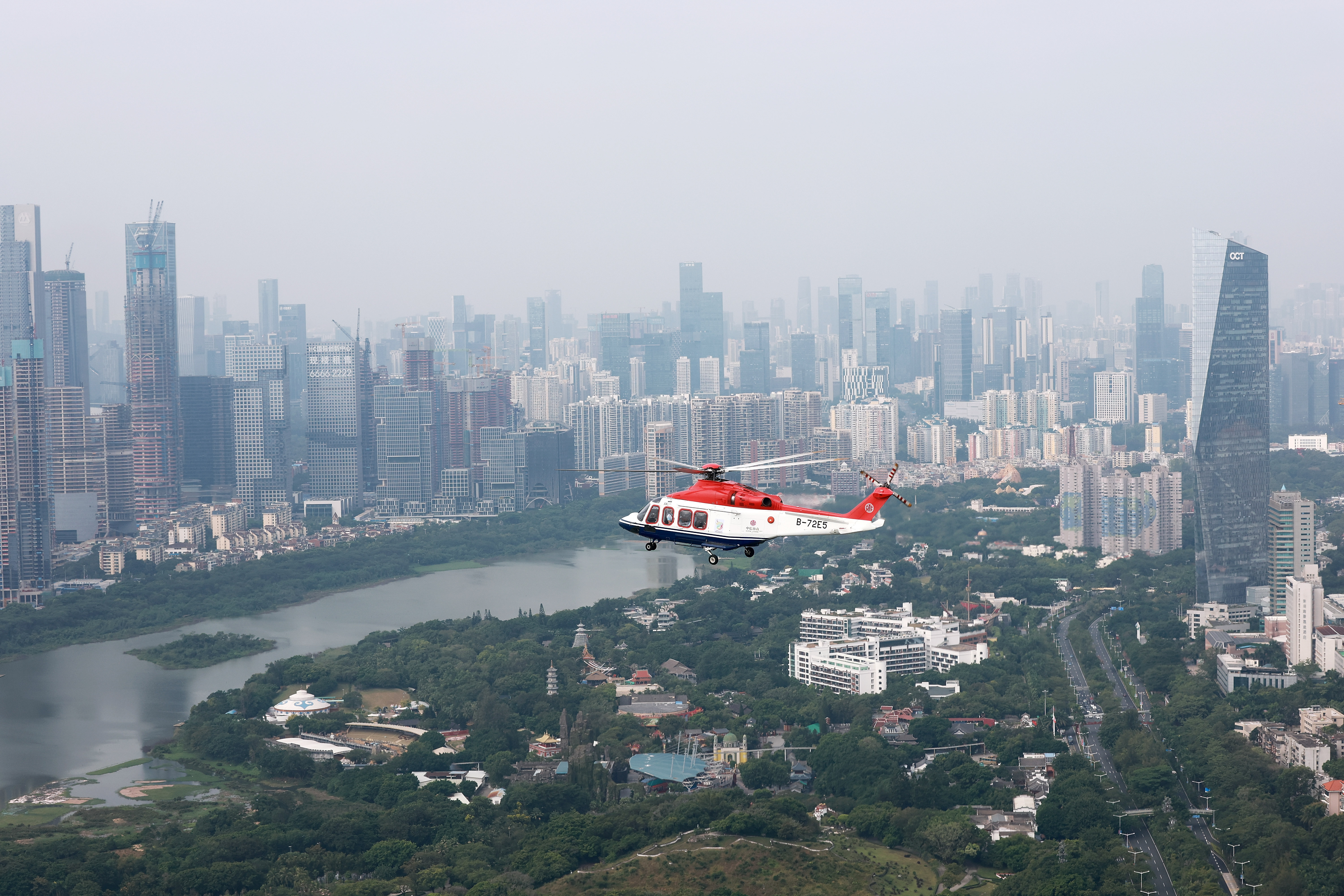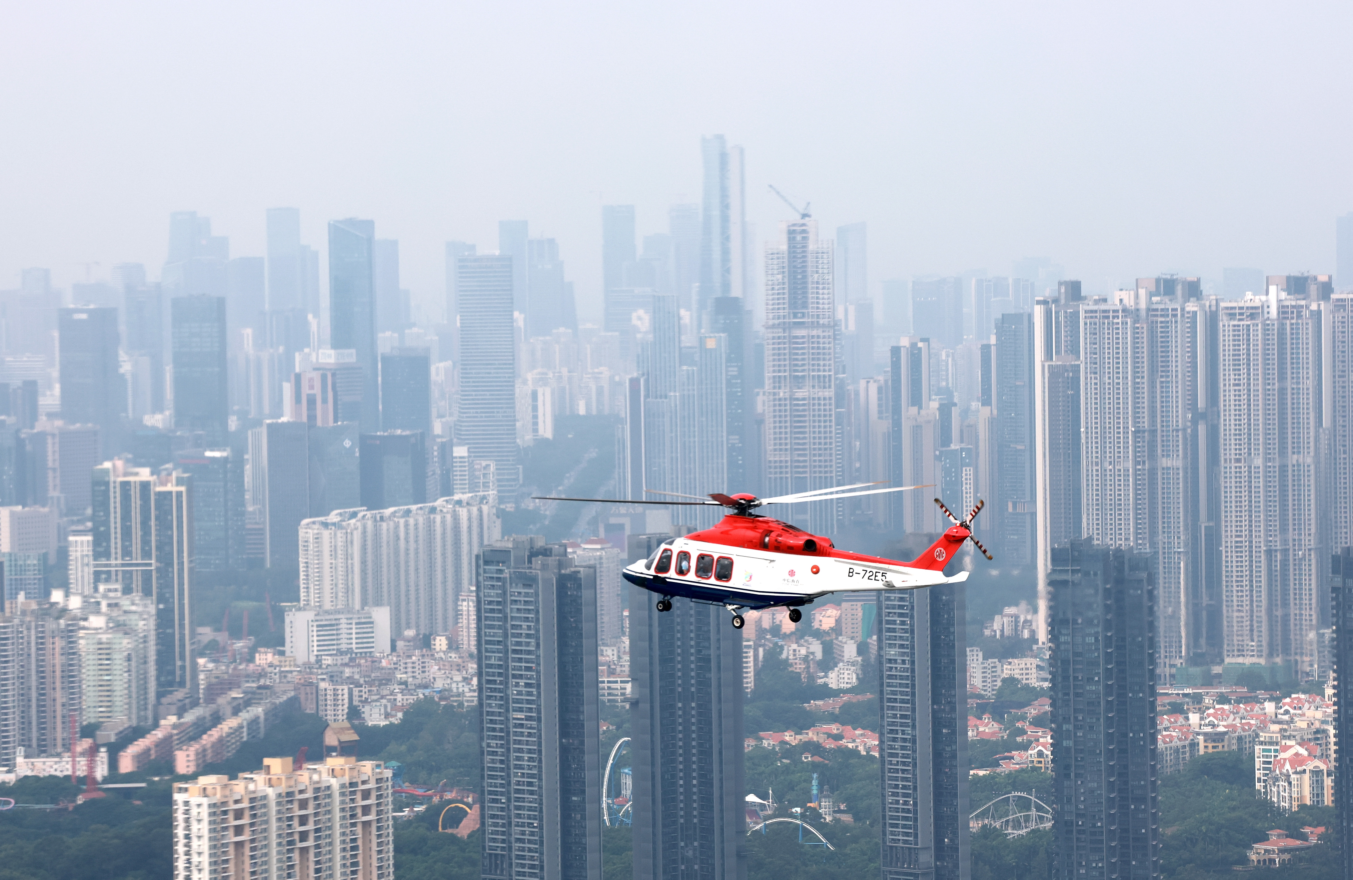 ↑ 搭载圣火的直升机进行空中传递。新华社记者 梁旭 摄