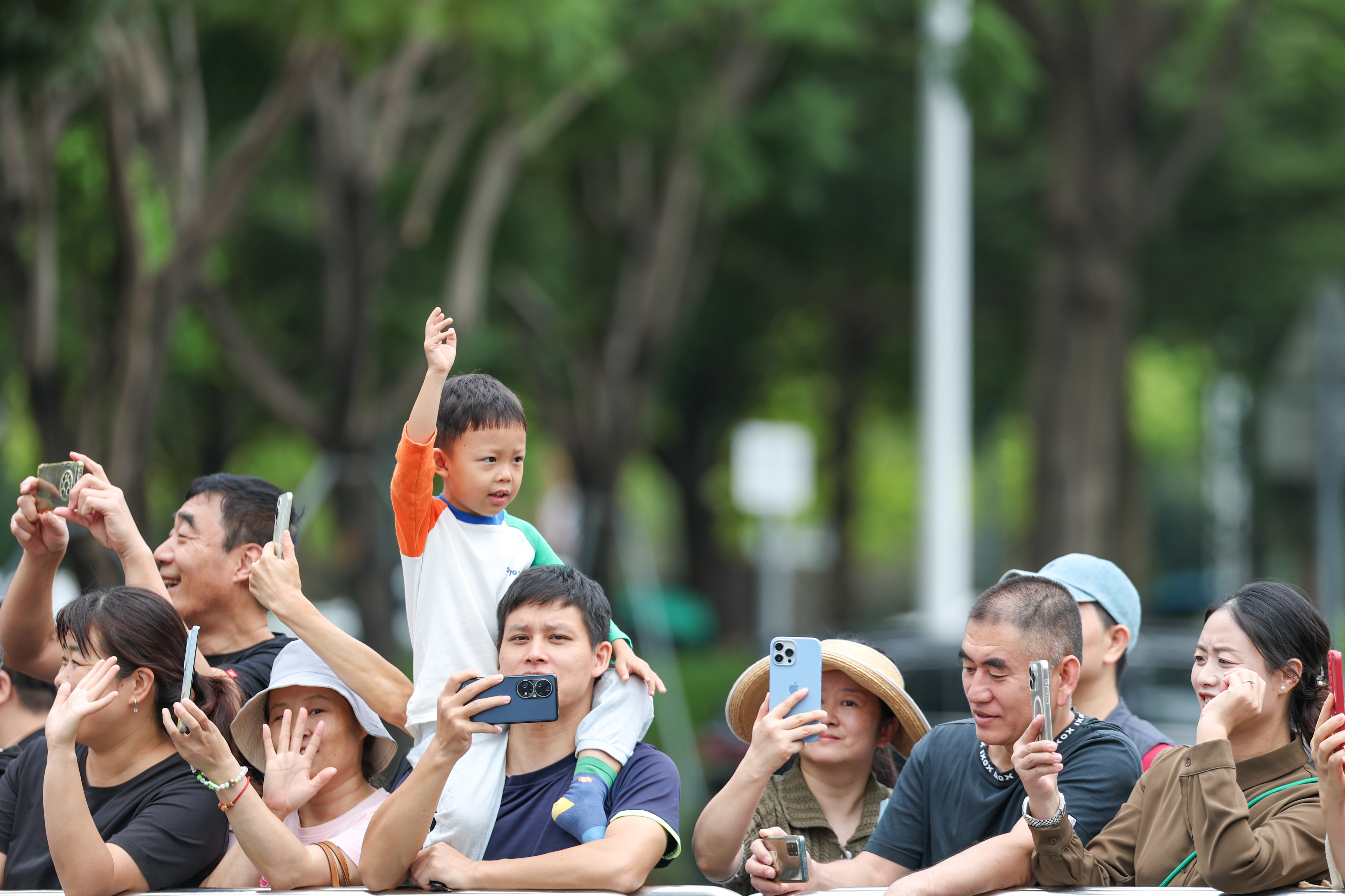 ↑ 观众在火炬传递活动中为火炬手加油。新华社记者 黄伟 摄
