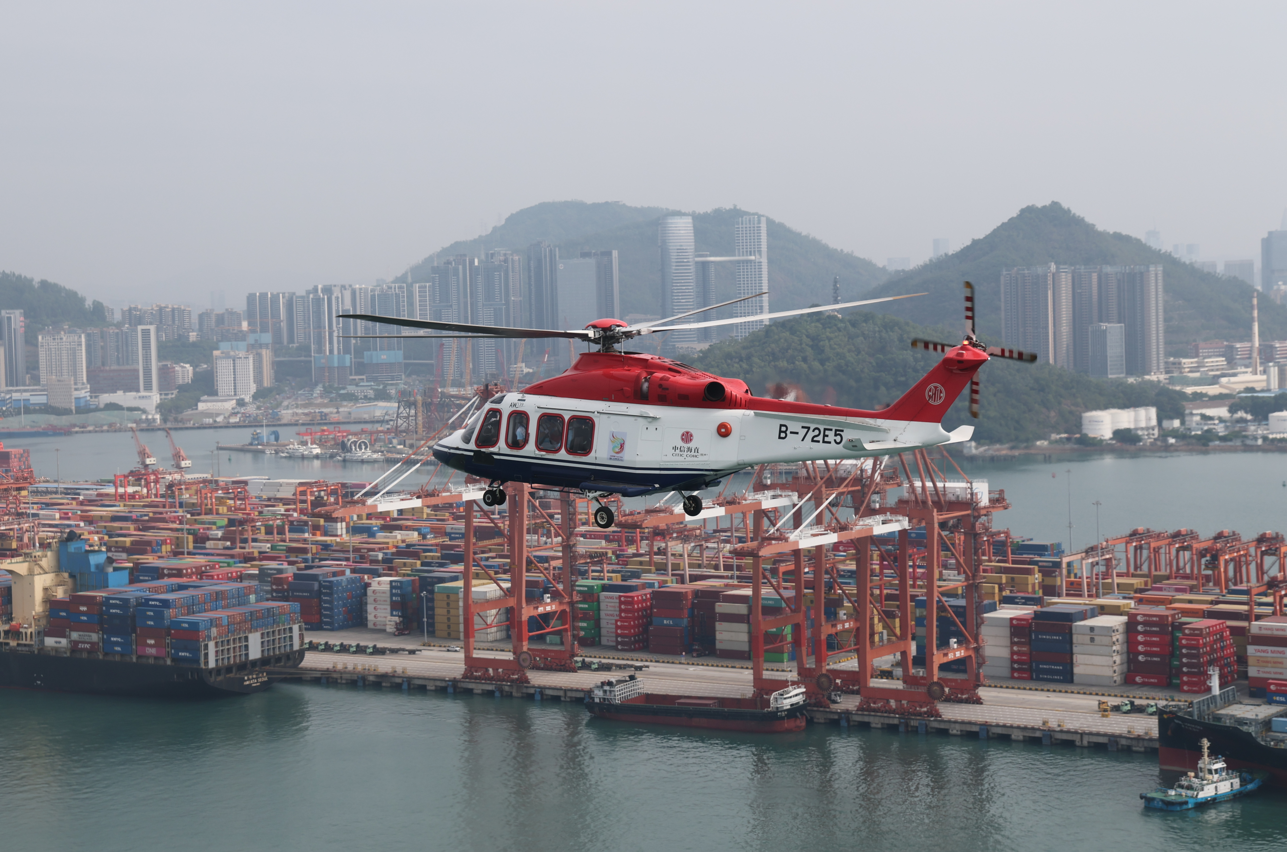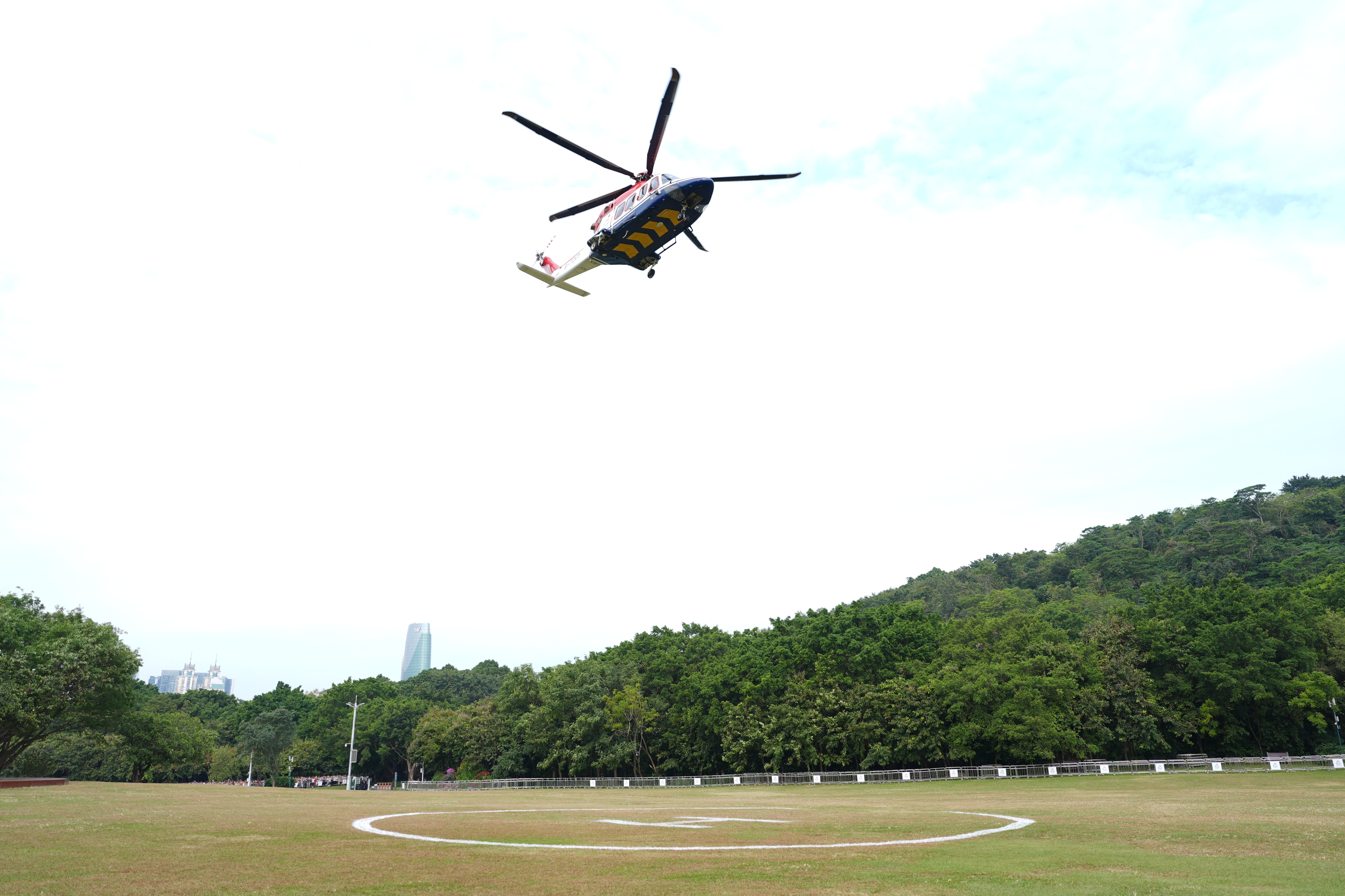 ↑ 搭载圣火的直升机进行空中传递。新华社记者 江汉 摄