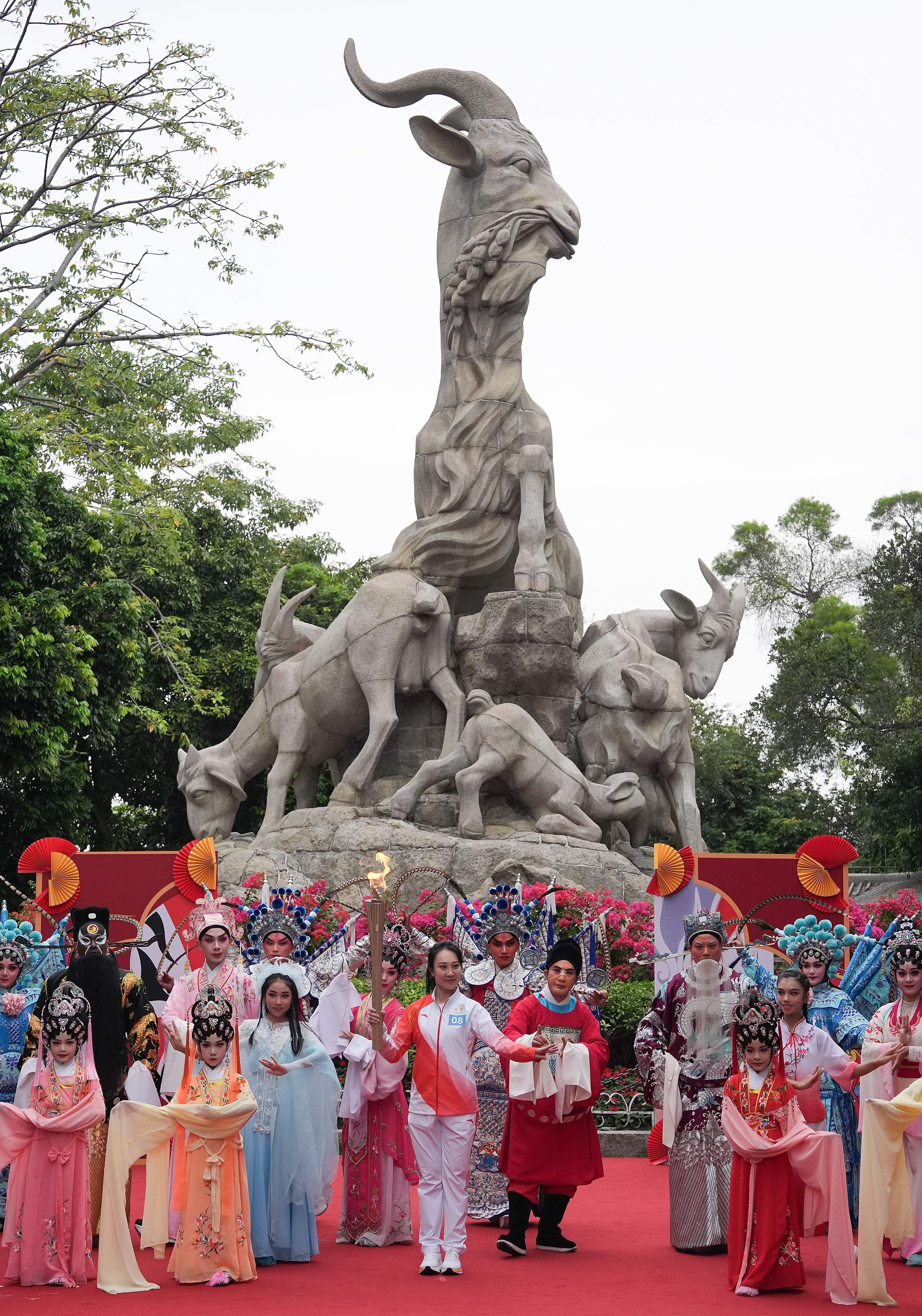 ↑ 火炬手李嘉宜(中)在广州越秀公园内的五羊雕像前传递火炬。新华社记者 杜宇 摄