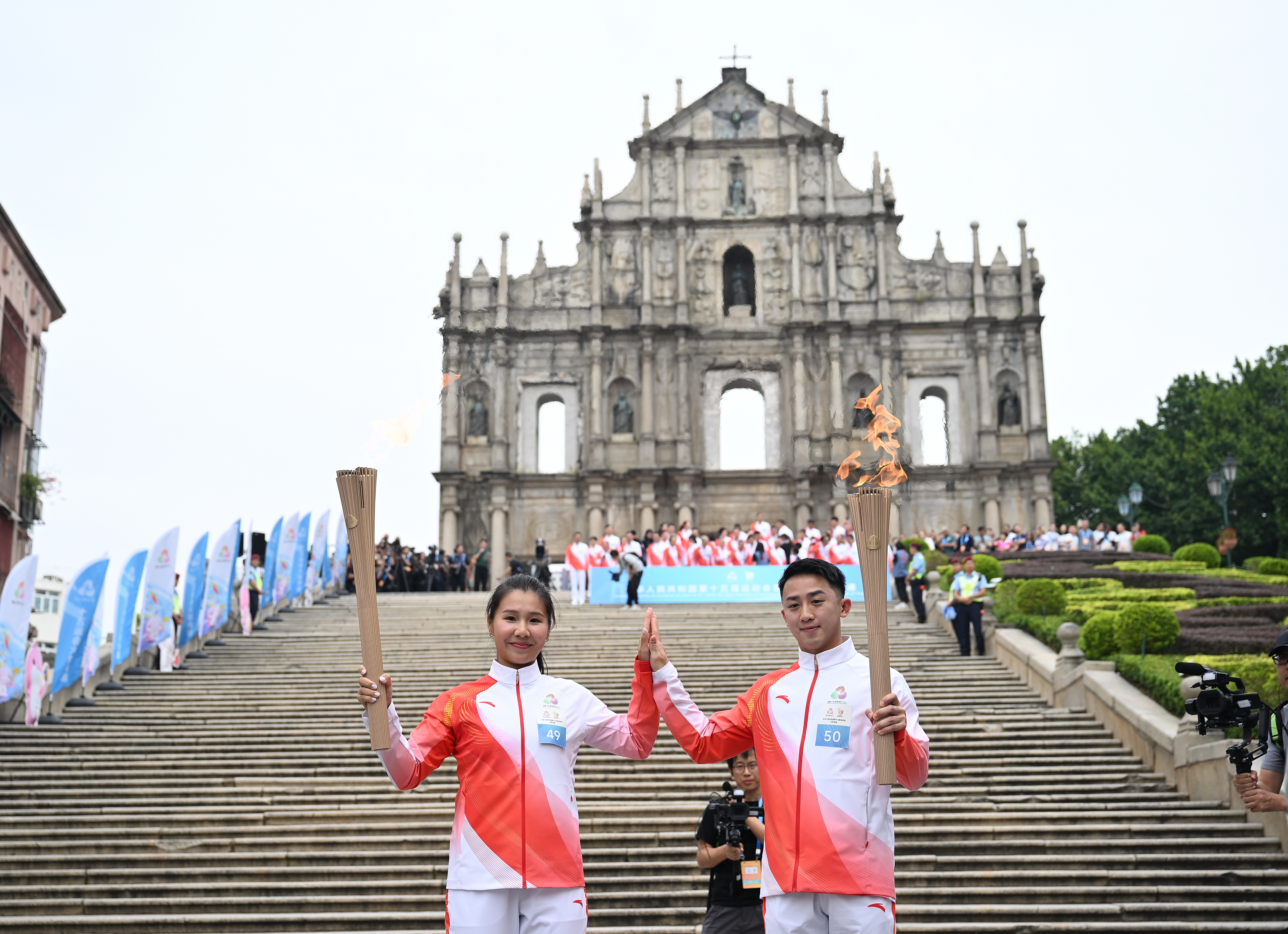 ↑ 火炬手郭建恒(右)、区海欣在大三巴牌坊前传递火炬。新华社发(张金加摄)
