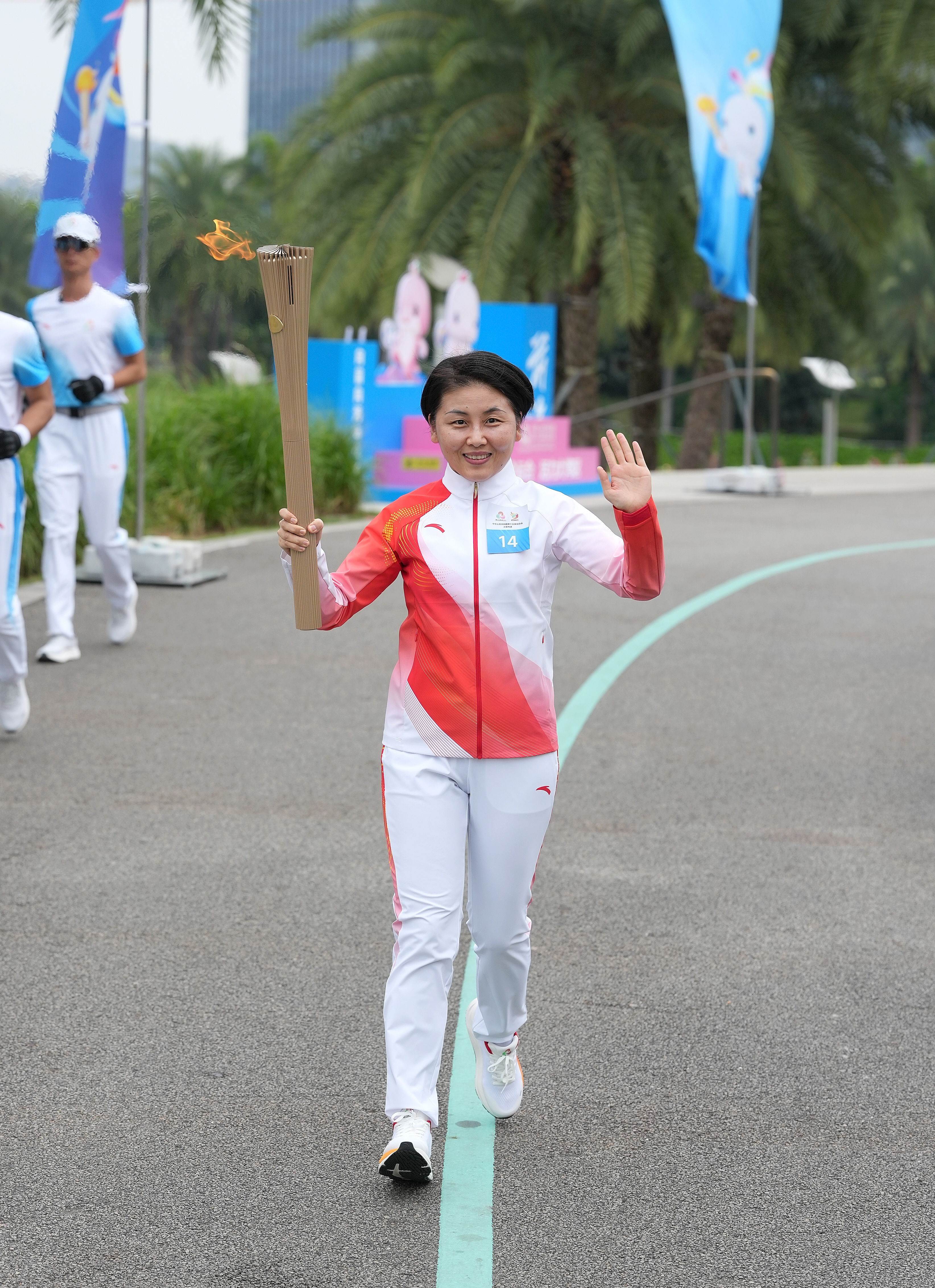 ↑ 火炬手何超琼在火炬传递活动中。新华社记者 那宇奇 摄