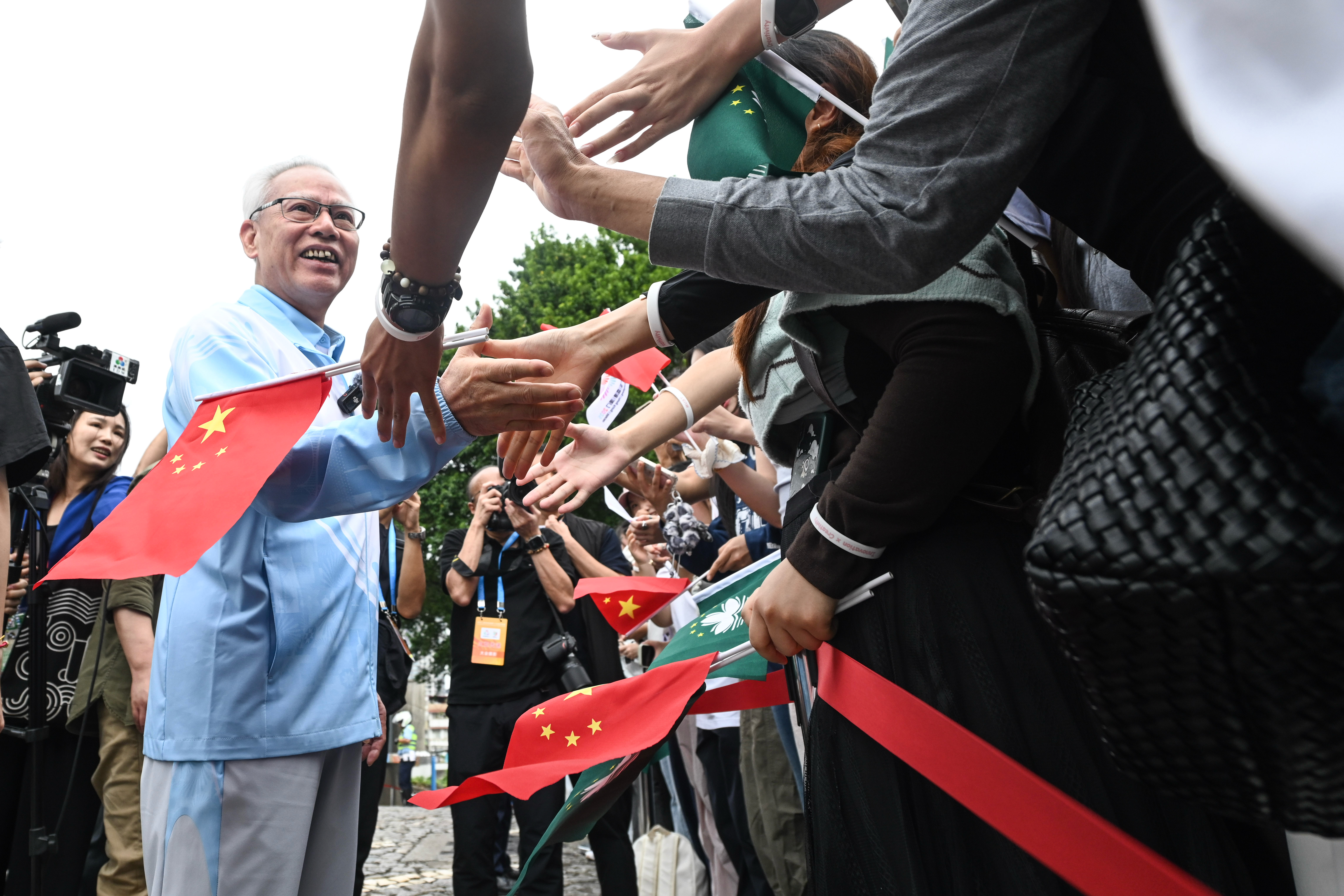 ↑ 澳门特区行政长官岑浩辉(左)在火炬传递活动中和观众握手。新华社记者 那宇奇 摄
