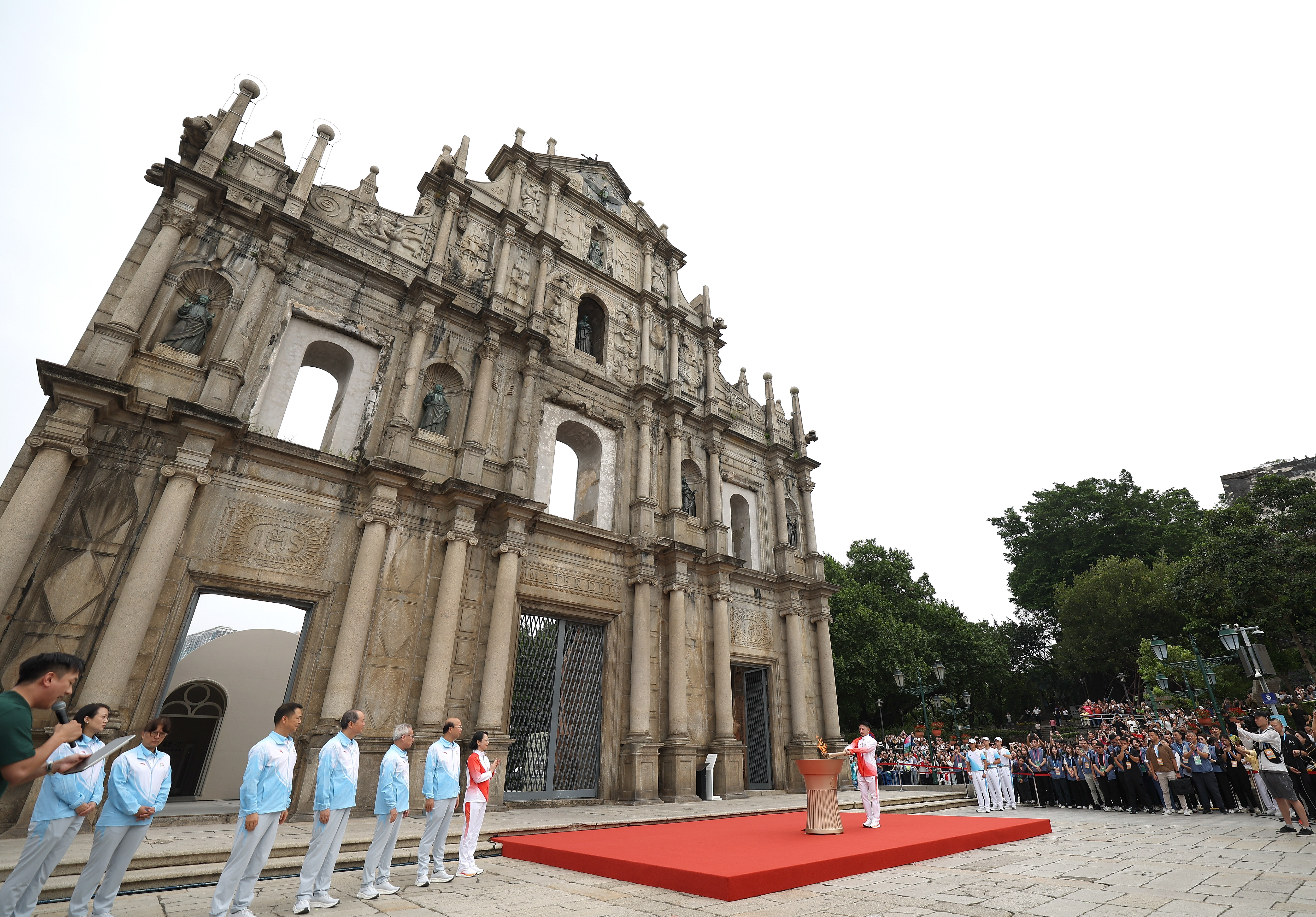 ↑ 火炬手郭建恒(中)在大三巴牌坊前点燃圣火盆。新华社记者 胡星宇 摄
