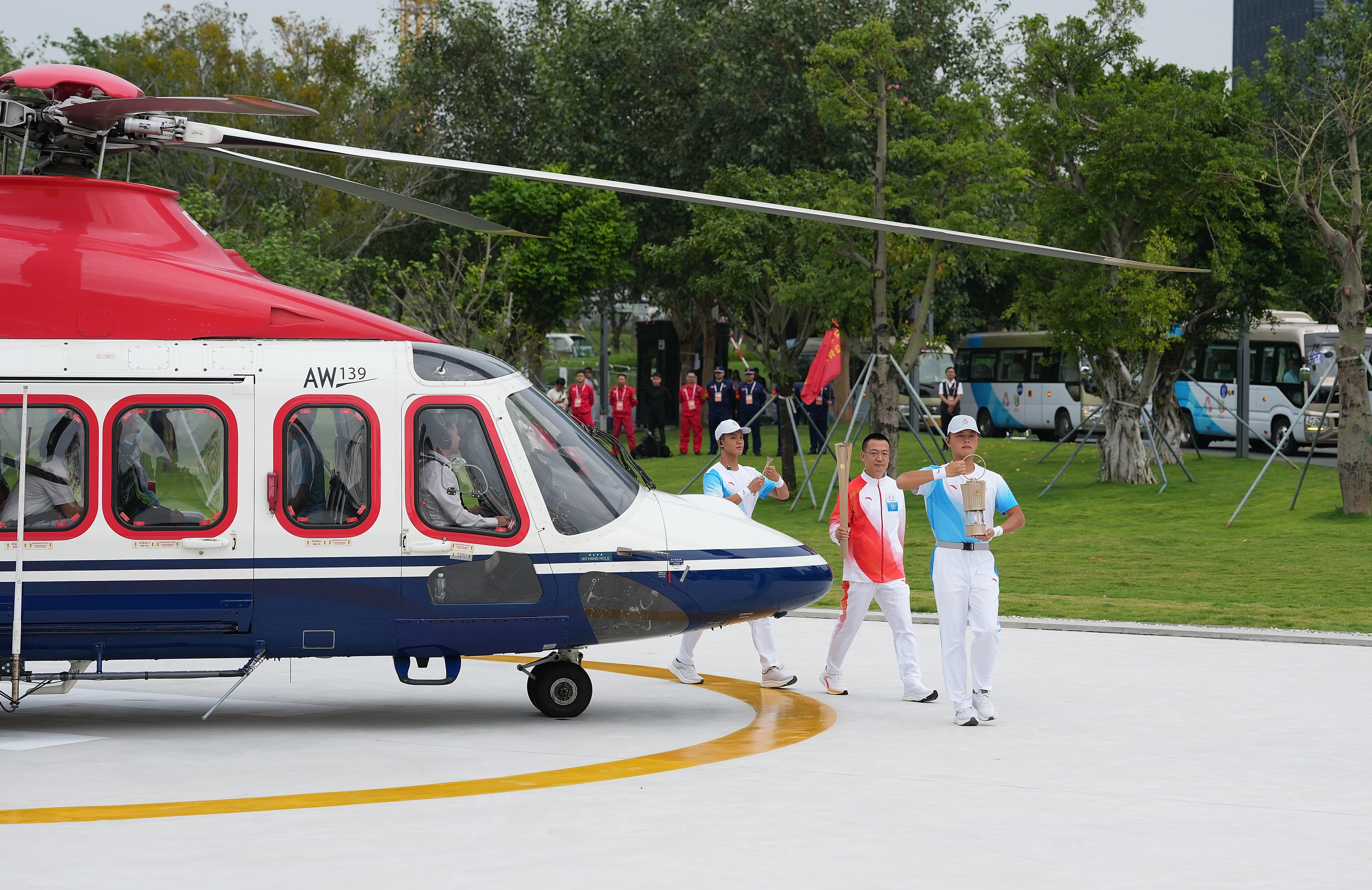 ↑ 火炬手兰小军(左二)手持火炬向直升机走去,他将进行空中传递。新华社记者 江汉 摄