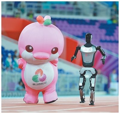 十五运会赛场,吉祥物与机器人互动。记者 陶相安摄