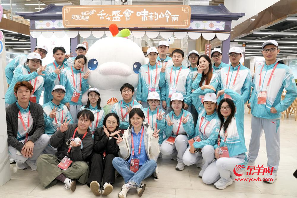 “小海豚”志愿者们与吉祥物“喜洋洋”合影。羊城晚报记者 张瑞柠 摄