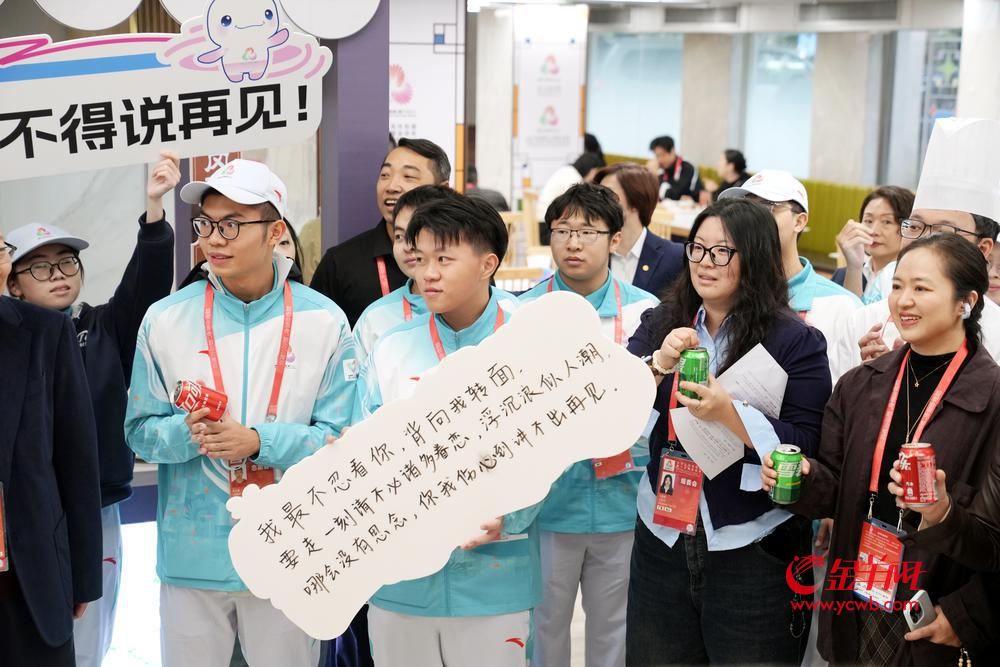 “十五运会,舍不得说再见,干杯!”11月21日,第十五届全国运动会赛程的最后一天,午餐时间,一场暖心的活动在十五运会主新闻中心媒体饭堂举行。组委会工作人员、“小海豚”志愿者们、媒体记者等在这里暖心话别。