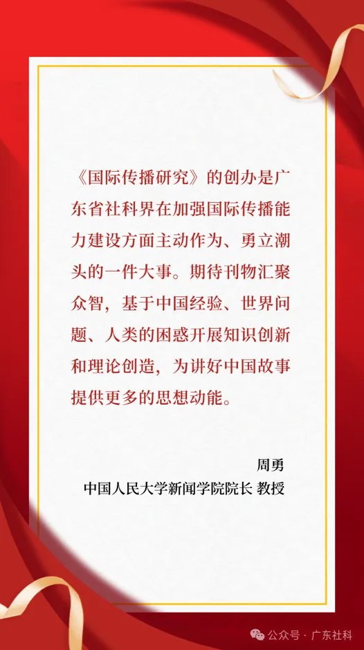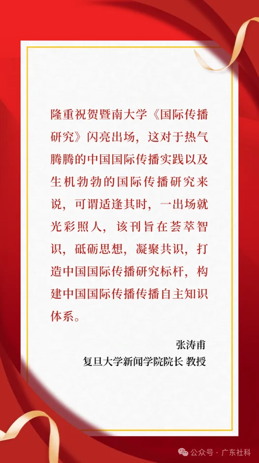 学界代表为《国际传播研究》集刊送上诚挚寄语。各位专家学者立足全球传播生态变革的时代背景,肯定了集刊创刊的战略价值与学术意义,认为其为建构中国特色国际传播自主知识体系搭建了重要平台。寄语中既饱含对集刊坚守政治底色、严把学术质量的期许,也提出了深化跨学科融合、推动理论与实践互促、搭建中外学术交流桥梁的殷切希望,鼓励集刊以高质量学术成果回应中国之问与世界之问,成为彰显中国智慧、发出中国声音的高水平学术阵地。