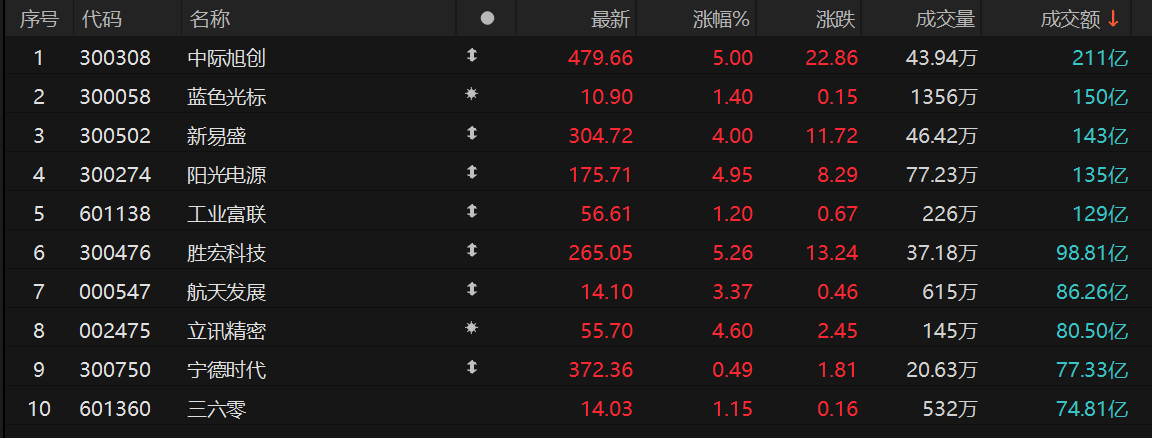中际旭创成交额居首,为211亿元。其后是蓝色光标、新易盛、阳光电源、工业富联,成交额分别为150亿元、143亿元、135亿元、129亿元。