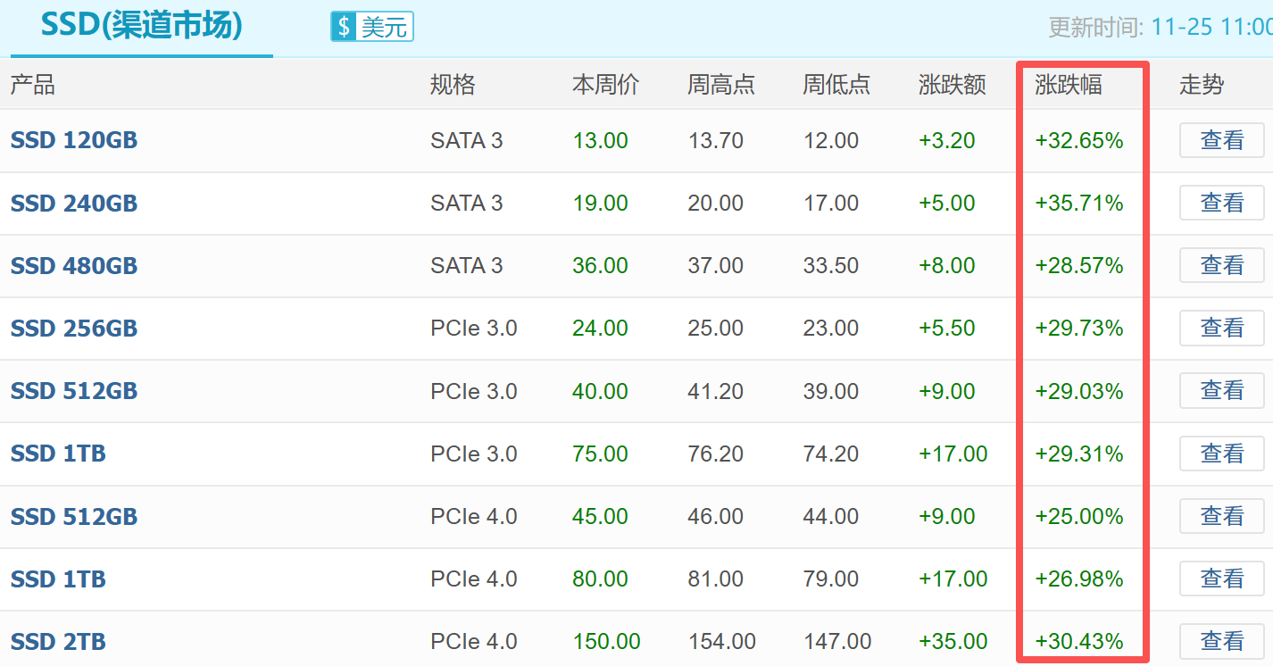 存储市场方面,本周涨价还在持续。根据CFM闪存市场,截至11月25日,DDR4、DDR5各类产品的周涨幅高达2.38%-16.67%,固态硬盘SSD涨价更为明显、周涨幅高达25%-35.71%。