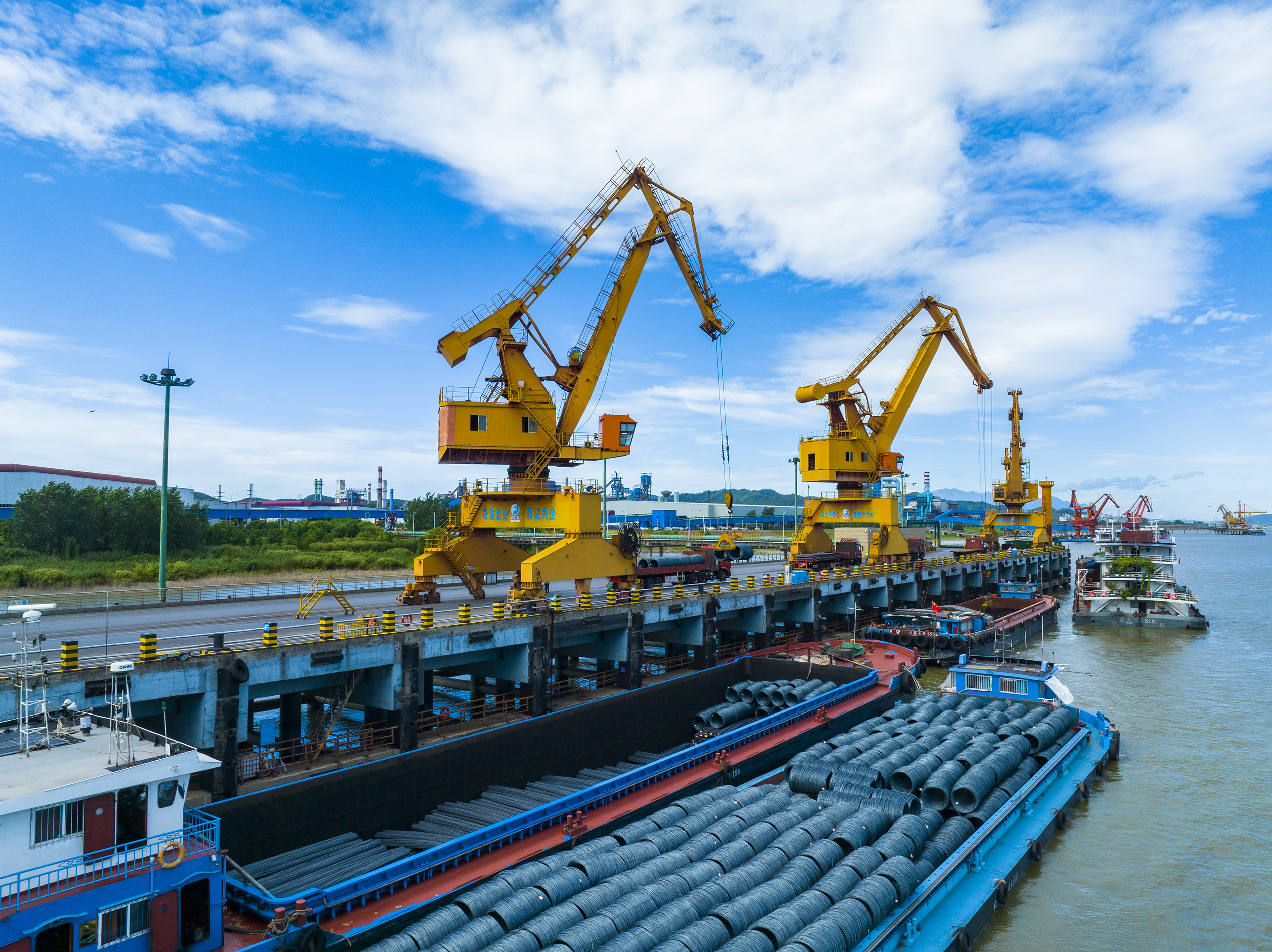 在方大集团九江萍钢钢铁有限公司位于长江边的码头,塔吊在装卸货物(2025年7月20日摄)。新华社发(张玉摄)