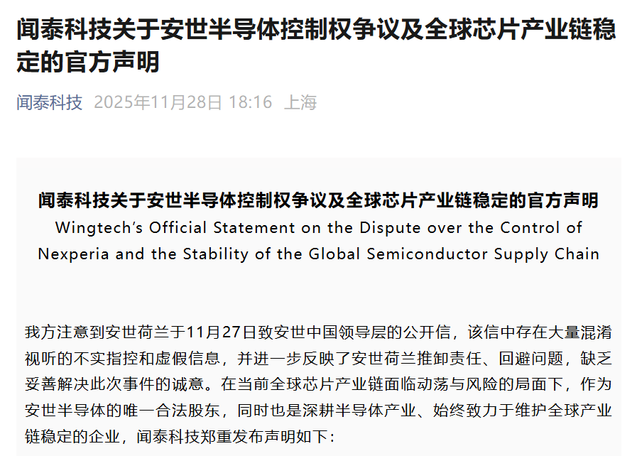 针对隔夜荷兰安世半导体的公开信,闻泰科技方面再度发表公开声明“回怼”。