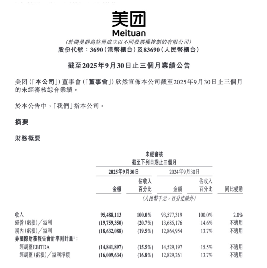 11月28日,美团(3690.HK)发布第三季度业绩报告。数据显示,本季度公司实现营收955亿元,同比增长2%,但核心本地商业板块因补贴战加剧亏损141亿元,整体经调整净亏损达160亿元。