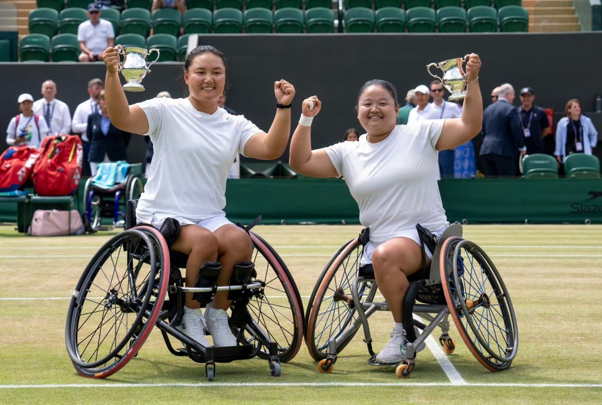 突破的脚步还在继续。今年温网,王紫莹/李晓辉再接再厉,夺得两人合作的第二座大满贯女双冠军。更令人振奋的是,在温网女单决赛中,王紫莹力克头号种子、日本名将上地结衣,成为中国首位轮椅网球大满贯单打冠军,同时包揽了今年温网单双打两项桂冠。