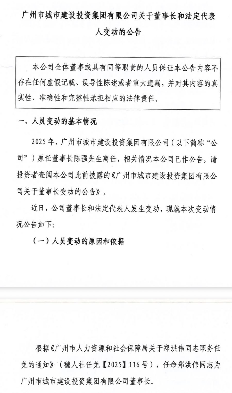 11月28日,广州市城市建设投资集团有限公司发布公告称,近日,公司董事长和法定代表人发生变动。根据《广州市人力资源和社会保障局关于郑洪伟同志职务任免的通知》(穗人社任免【2025】116号),任命郑洪伟同志为公司董事长。