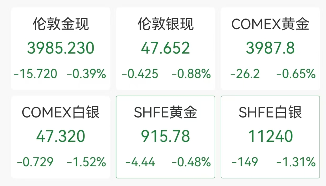 A股、港股有色金属股午后普跌,港股灵宝黄金跌超7%,洛阳钼业、紫金矿业跌超6%。现货市场贵金属多数下跌,截至15:00左右,伦敦金跌近0.4%,伦敦白银跌近1%。