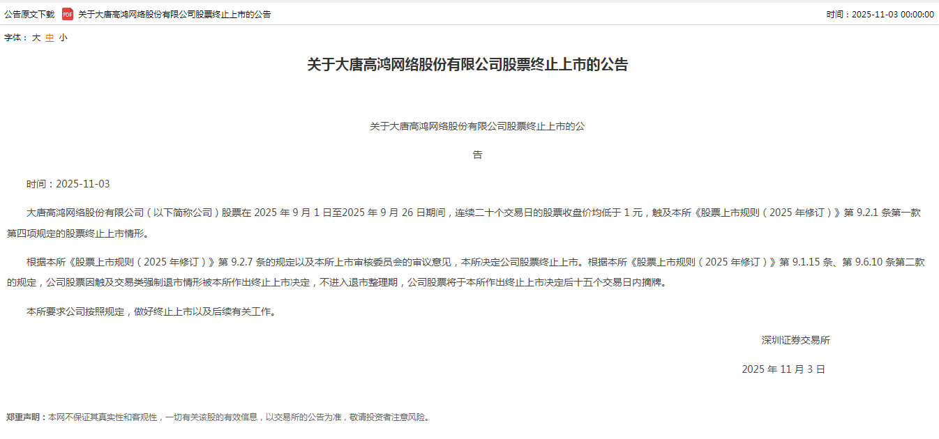 2025年11月3日晚间,大唐高鸿网络股份有限公司(*ST高鸿,证券代码:000851)发布重磅公告,公司股票已被深圳证券交易所作出终止上市决定。这家深陷财务造假与欺诈发行漩涡的上市公司,最终以“连续20个交易日股价低于1元”的交易类强制退市方式,为其长达9年的资本市场造假闹剧画上句号。值得注意的是,因触及交易类退市情形,*ST高鸿将跳过退市整理期,在15个交易日内直接摘牌。