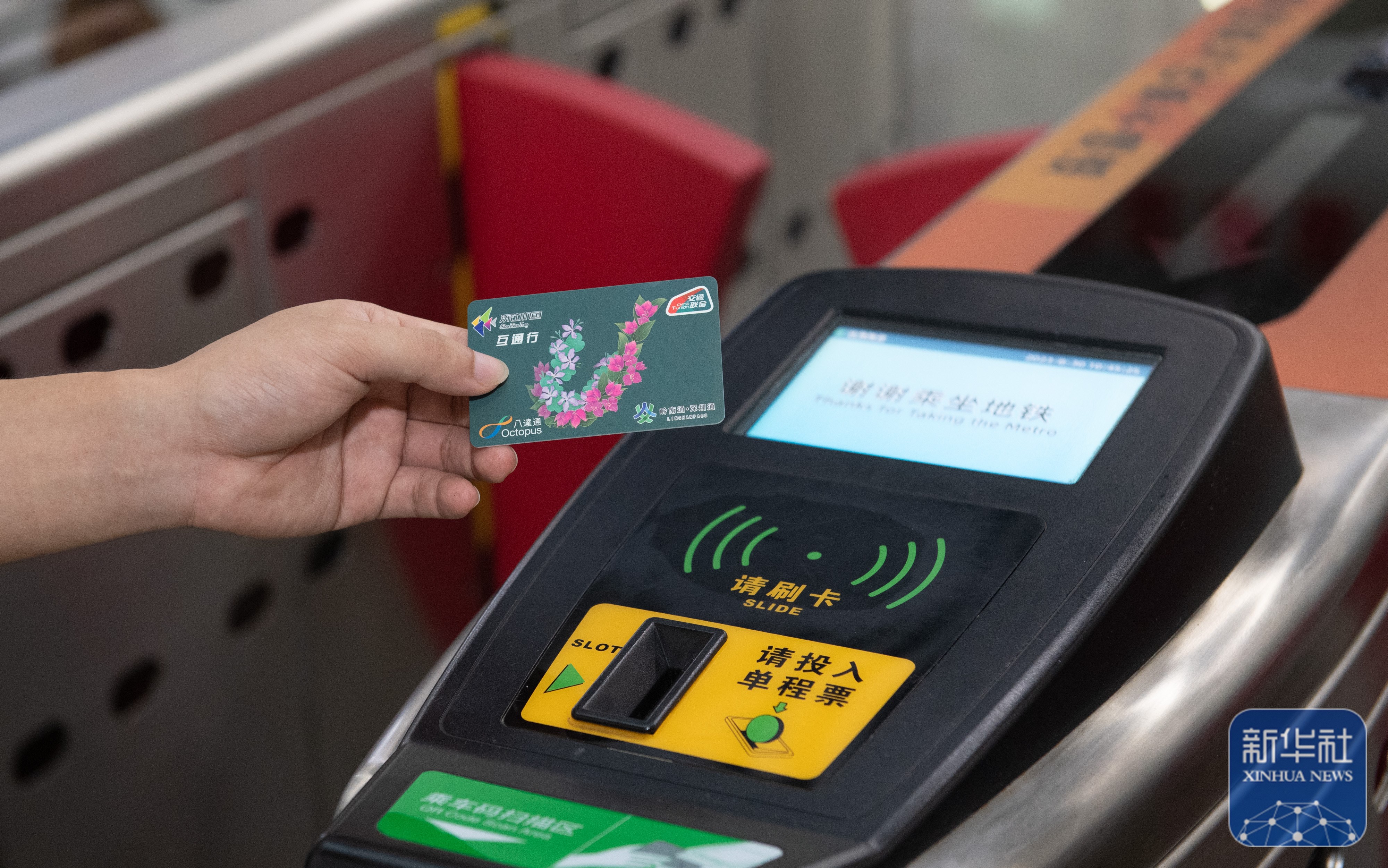 ↑在深圳福田站地铁闸机出口,用户持深港互通行卡准备刷卡(2023年8月30日摄)。新华社记者 毛思倩 摄