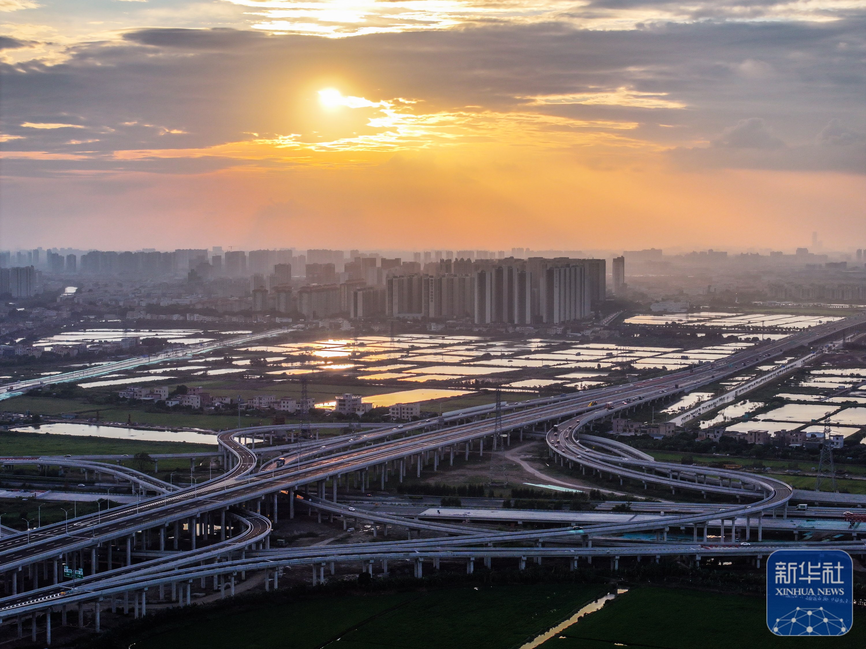 ↑沐浴在落日余晖里的南中高速新隆互通(2024年10月17日摄,无人机照片)。南中高速横跨广州、中山两市,南通珠海、西进江门、东达深圳,串联起粤港澳大湾区核心区域东西南北大通道。通车后从广州南沙15分钟可至中山城区,20分钟可达深圳宝安。新华社记者 刘大伟 摄