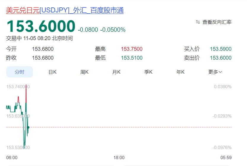 11月4日,美元兑日元一度向下触及154,截至8:20,跌至153.6。