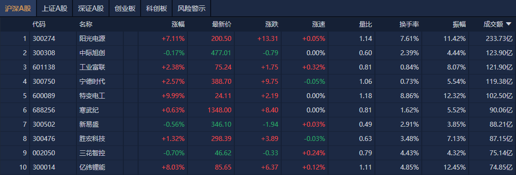 个股方面,阳光电源成交额超233亿元居首,中际旭创、工业富联、宁德时代成交额靠前。