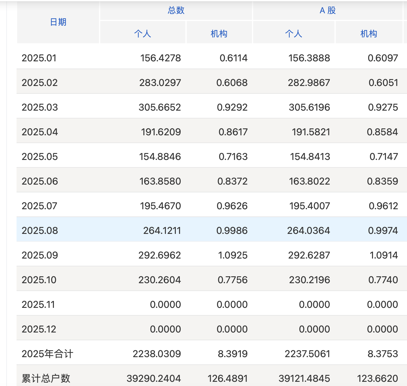 根据上交所官网披露的数据,2025年10月,上交所A股新开户数为230.99万户,较9月的293.72万户下降了21.36%;其中,10月个人新开户数为230.22万户,机构新开户数为0.77万户。