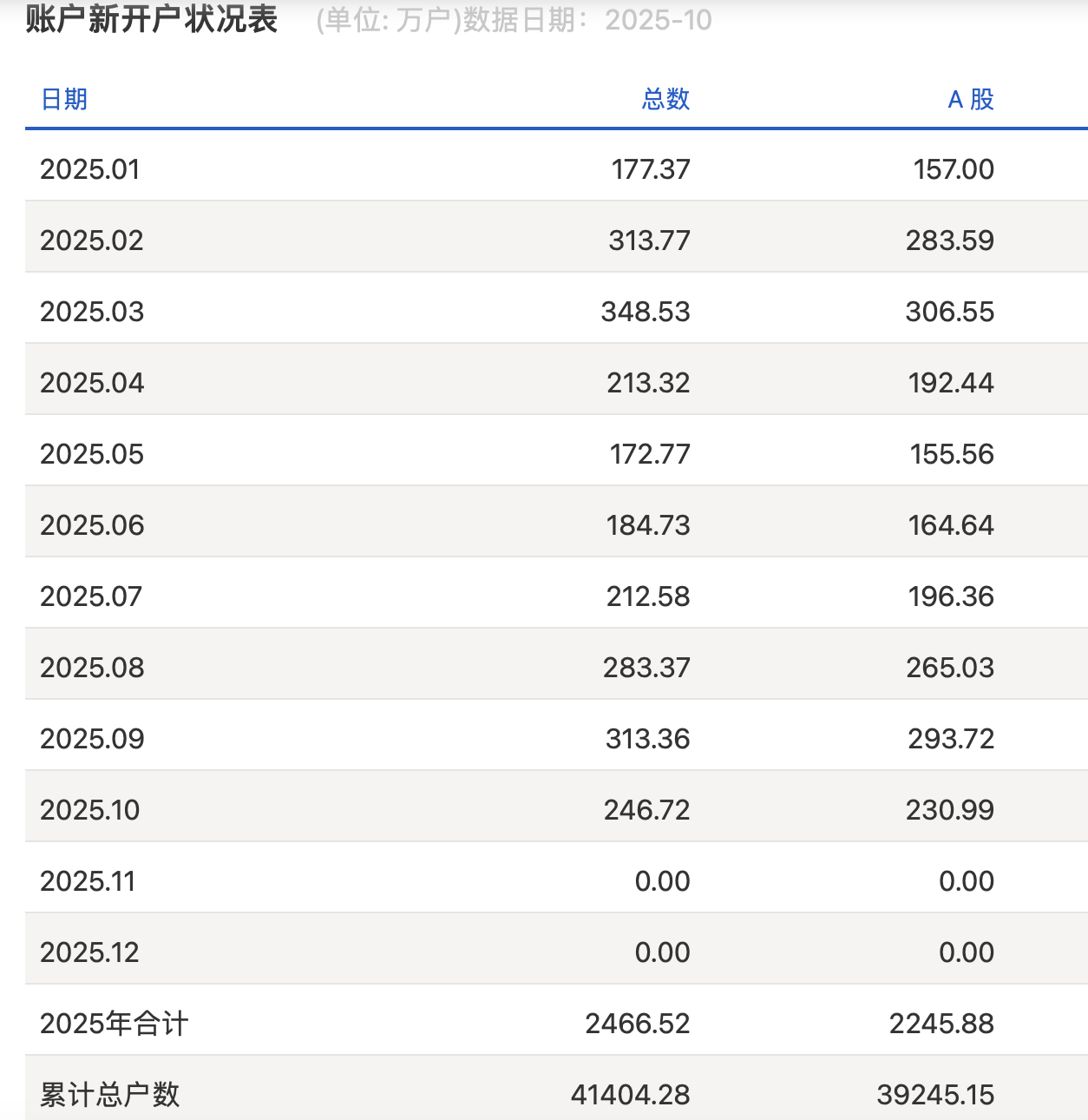 上交所官方数据显示,2025年10月,上交所A股新开户数为230.99万户。这意味着,今年前10个月,新增A股开户数达到2245.88万户,较去年同期增长了10.57%。