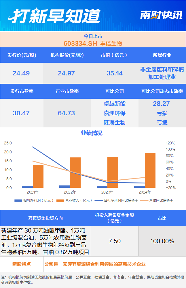 财务数据方面,丰倍生物2022-2024年分别实现营业收入17.09亿元、17.28亿元、19.48亿元,同比增长率依次为31.89%、1.12%、12.75%;实现归母净利润1.33亿元、1.30亿元、1.24亿元,同比增长率依次为30.85%、-2.73%、-4.54%。