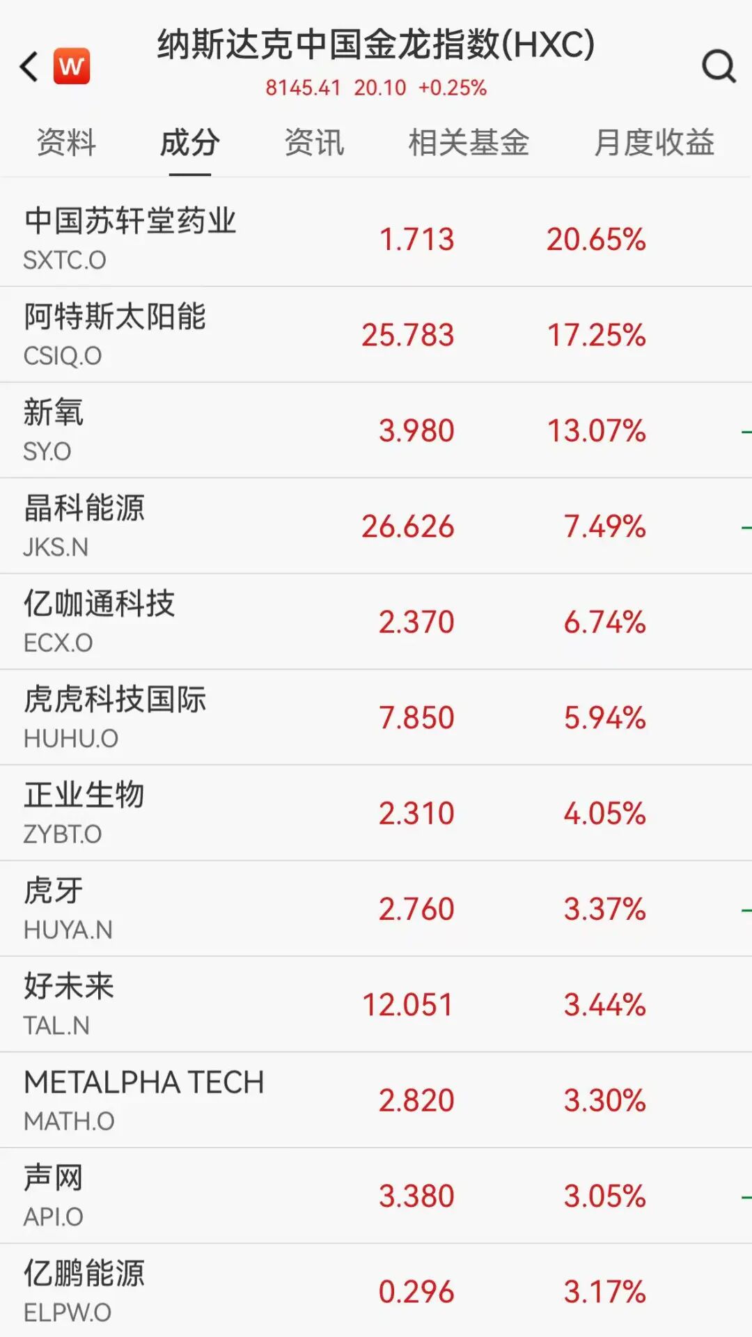 中概股方面,纳斯达克金龙指数开盘微跌后短线拉升翻红,现涨0.25%。中国苏轩堂药业大涨超20%,阿特斯太阳能、新氧涨超10%。