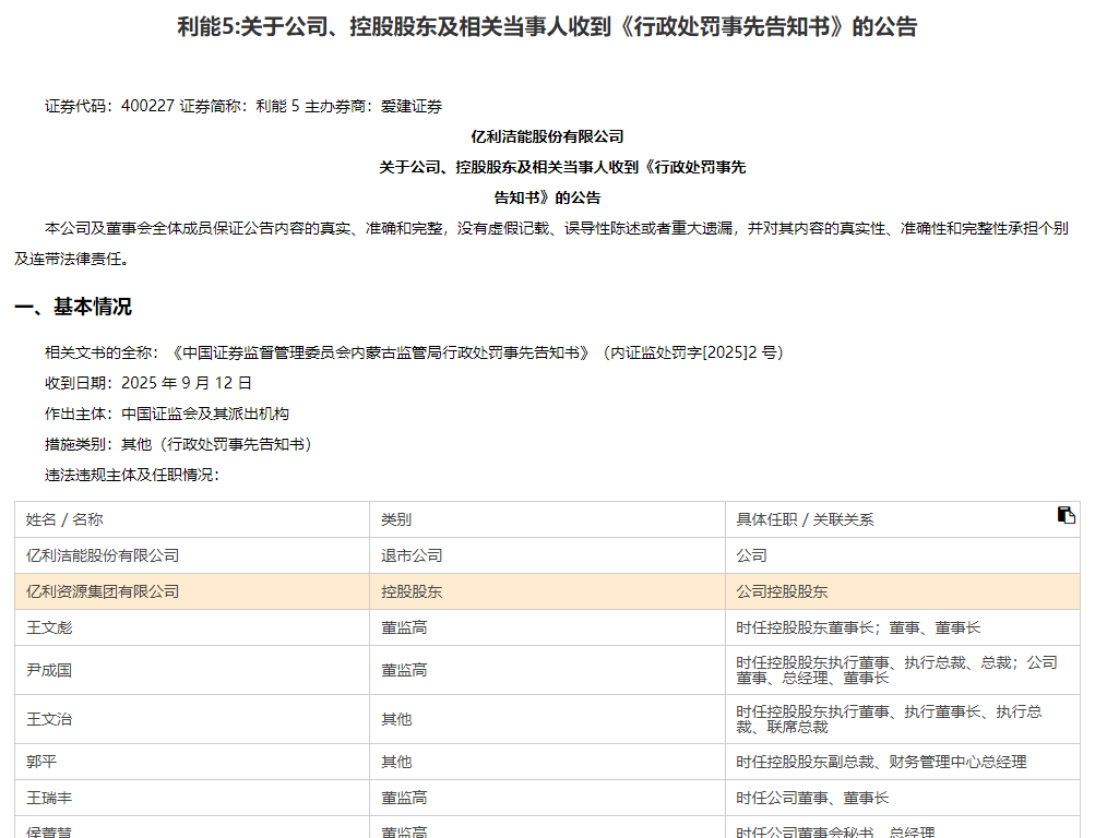 监管部门明确指出,控股股东亿利集团在整个违法违规活动中扮演了组织者、指使者的核心角色,是推动造假、违规担保及资金占用等行为的“幕后推手”,形成了“控股股东主导+上市公司执行”的违法模式。值得注意的是,亿利洁能已于2024年9月9日以“利能5”为名在老三板开始转让,目前处于挂牌转让阶段。