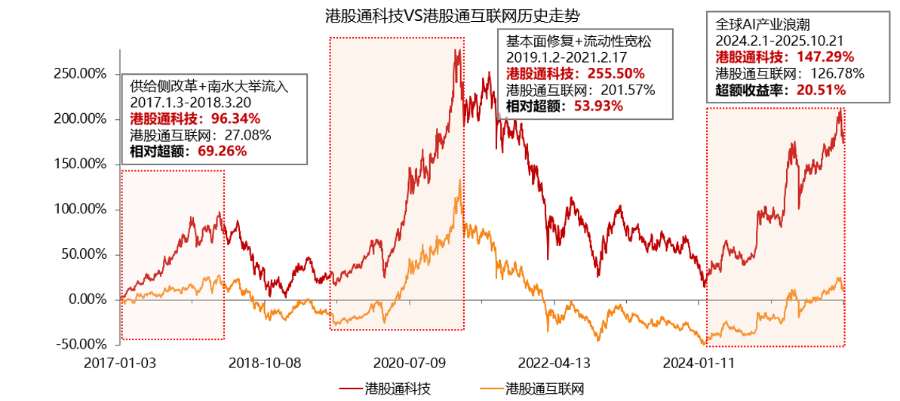自2017年初至2025年三季度末,港股通科技指数累计涨幅大幅跑赢港股通互联网指数。