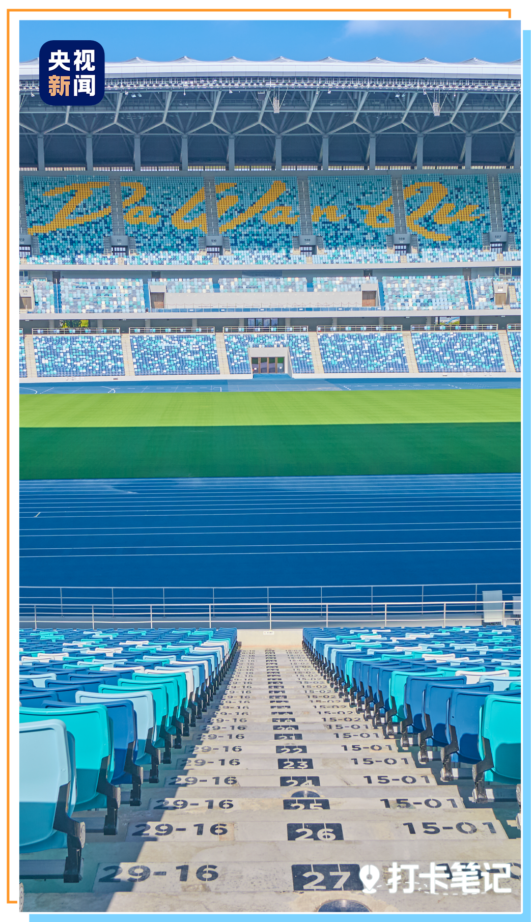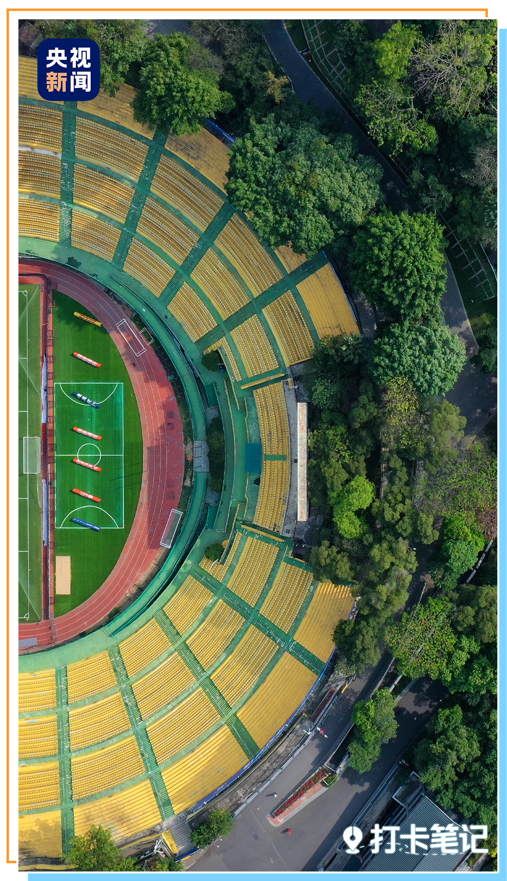 改造后的越秀山体育场颜值拉满:渐变黄座椅、深绿挡墙、天蓝跑道、绿茵场,复古的撞色很有质感, 随手一拍都是怀旧大片!