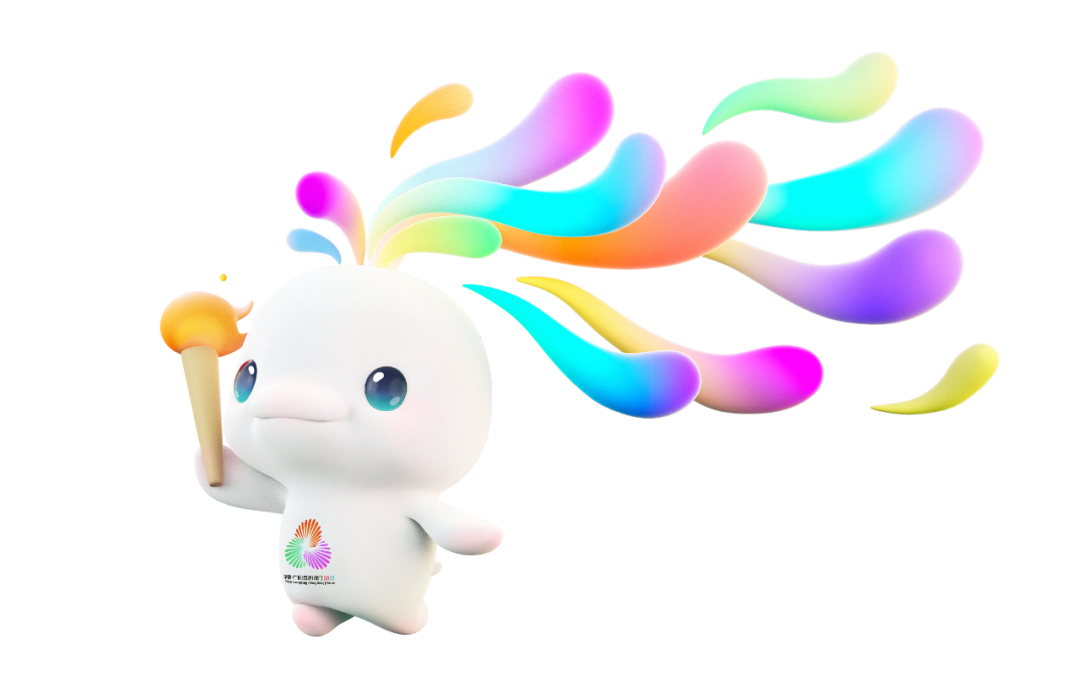 这两只萌物的头顶可不是“鸡冠”,而是三色浪花,融合了 广东木棉红 、 香港紫荆紫 和 澳门莲花绿 , 分别代表广东、香港、澳门三个联合承办本届赛事的地区。从正面看,这三色浪花还构成了一颗爱心的形状,寓意着三地同心;而为海豚添上手和脚,是为了更好表现运动姿态与动态美感。