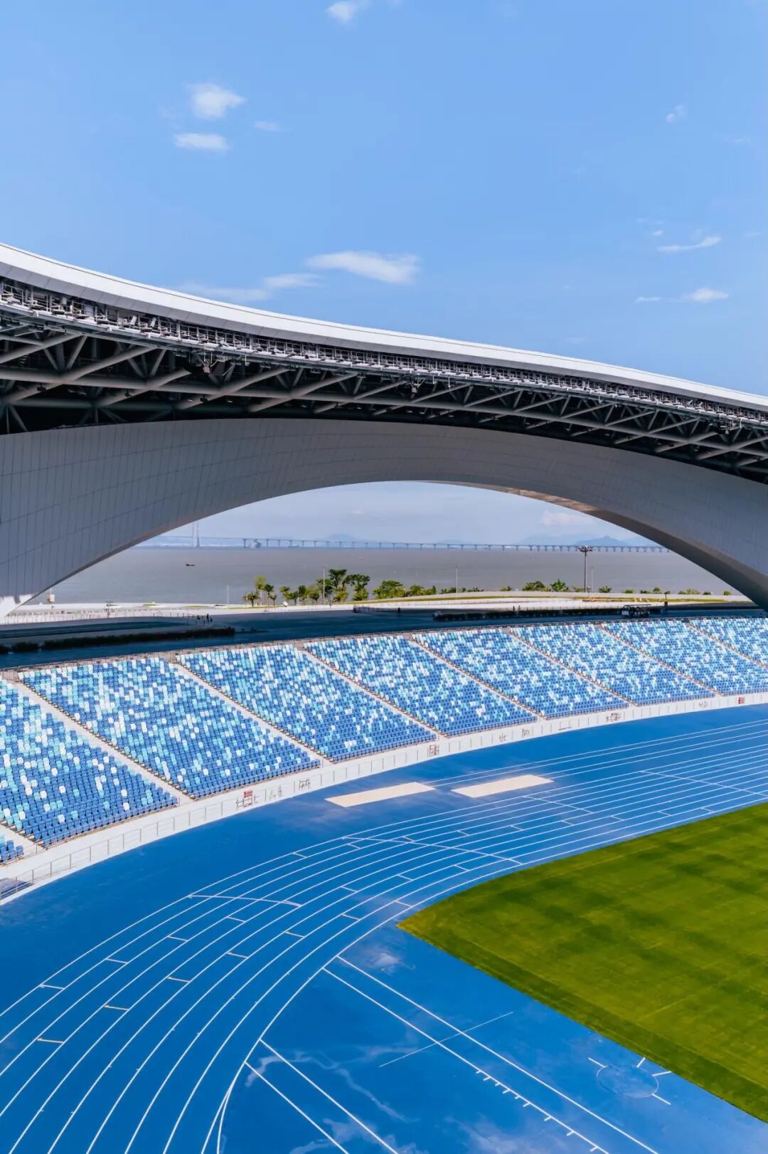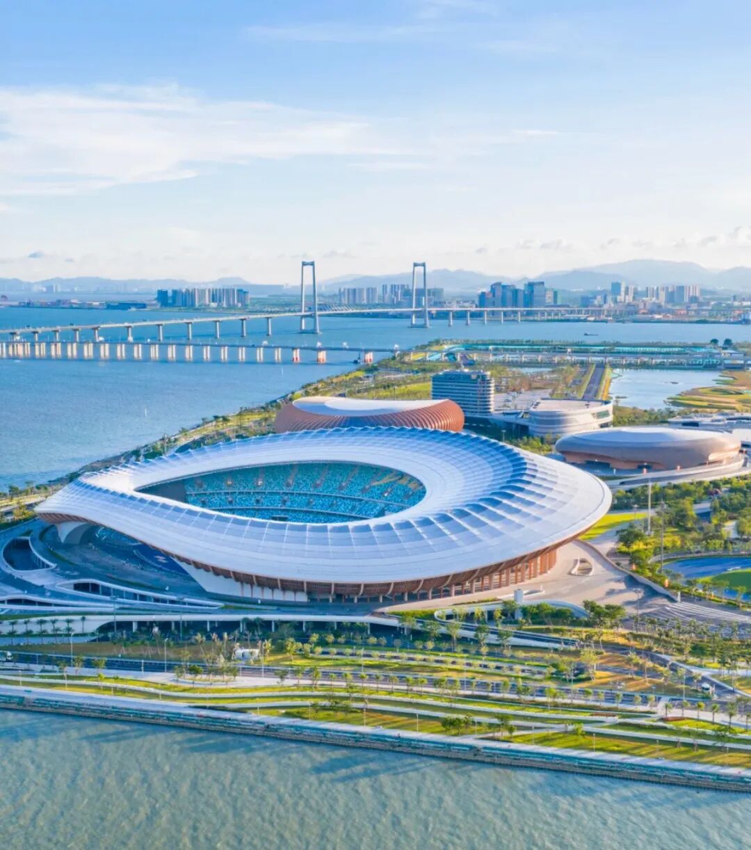 其一大亮点在于综合体育场馆的设计:通过宽约145米、高约22米的大拱架构,巧妙地构筑出 “边看比赛边看海”的独特视野。观众于席间可远眺深圳前海、深中通道与无垠大海。