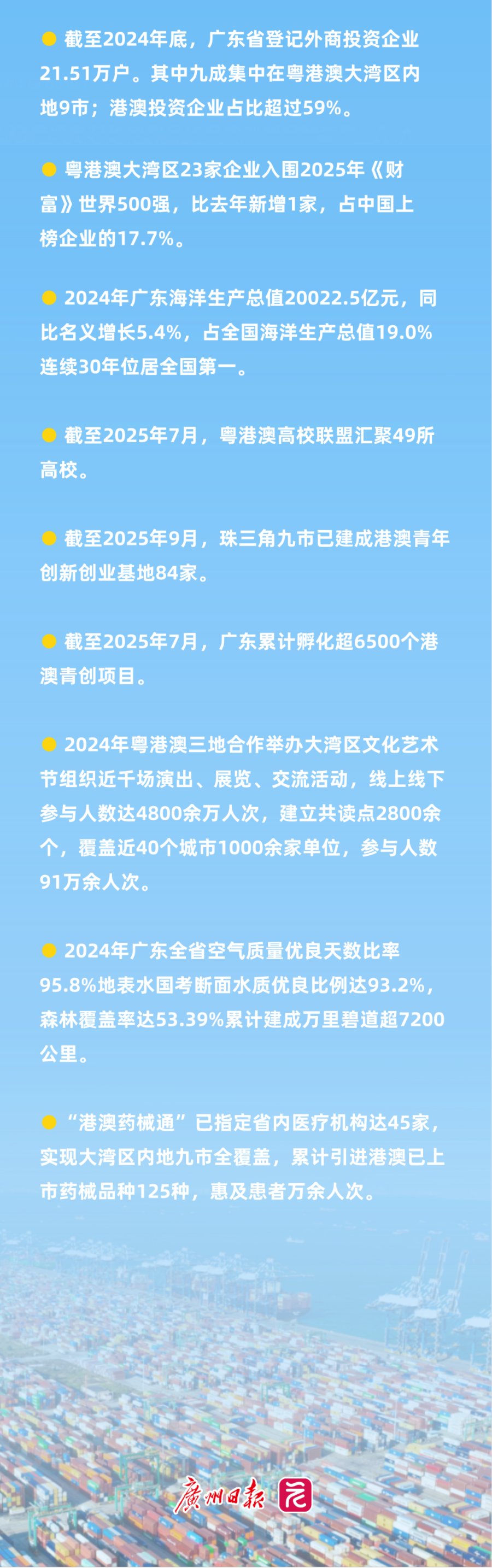 社会保障与医疗服务的跨境融合,更是让大湾区居民享受到实实在在的便利。目前,“湾区社保通”服务网点已覆盖香港14个行政分区和澳门全部行政分区。2024年11月,“大湾区跨境直通救护车试行计划”启动,采用粤港两地牌照救护车执行点对点转运服务,实现跨境患者高效转运。“长者医疗券大湾区试点计划”让合资格香港长者可在广东省内21家指定医疗机构直接使用医疗券,目前已实现大湾区内地九市全覆盖。此外,广东携手港澳探索养老服务“湾区模式”,全省共有港澳服务提供者开设或运营的养老服务机构12家,全省养老服务机构收住港澳籍老年人1600多人。(文/广州日报全媒体记者伍仞、何颖思、林欣潼)