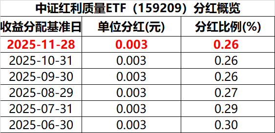 中证红利质量ETF(159209)方面,根据公告内容,该ETF本月每十份分红0.03元,分红比例0.26%,也是本周五(12月12日)进行权益登记。