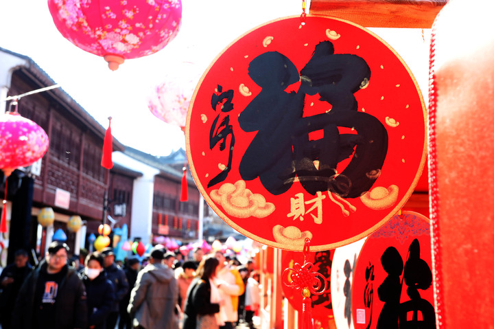 2025年1月29日,农历正月初一,江苏苏州桃花坞唐寅故居文化区举行“姑苏年市·新春非遗游园会”活动,现场悬挂着福字等节庆装饰品。新华社发(杭兴微摄)