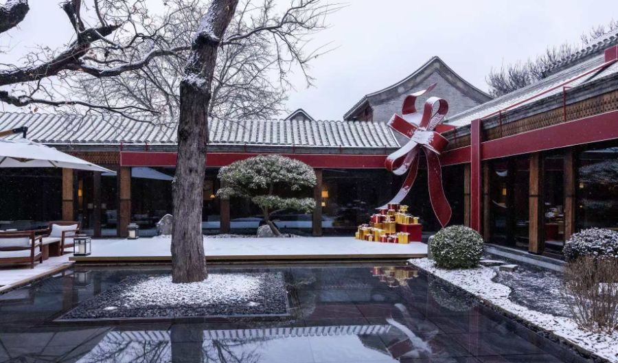 (前门文华东方酒店的雪景与节日氛围浓郁)