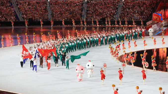 粤港澳三地同步升国旗、唱国歌,三地代表团在《我和我的祖国》大合唱当中联合入场,三地演职人员携手打造文体展演,三地运动员共同传递火炬、点燃火炬。在香港、澳门,街头随处可见的全运会灯饰、赛场内一票难求的火爆场面,堪比“超级巨星演唱会”的热烈氛围……在“家门口”参与国家盛事,让港澳同胞的国家认同感、民族自豪感不断提升。