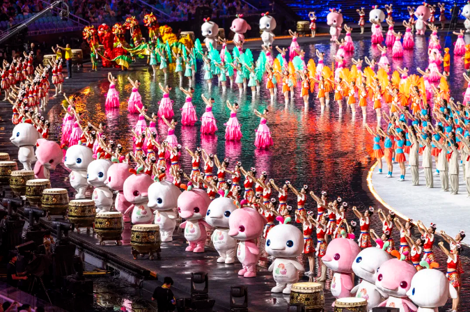在开幕式上,智能机器人敲响千年青铜句鑃,大型“鳌鱼”遨游半空,醒狮在AIGC里“蹦迪”,英歌锣鼓“撞”上全息投影,龙舟竞渡通过AR技术“划”入观众席……岭南文化与前沿科技的深度融合,“城市合伙人”等创新举措,彰显出大湾区奔涌不息的创新力量。