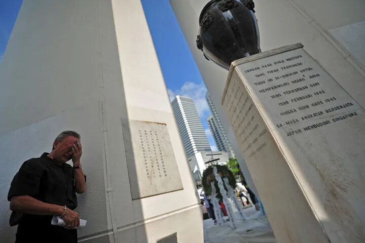 2015年2月15日,一位市民在新加坡美芝路战争纪念公园举行的祭礼上悼念死难者。当日,新加坡中华总商会举行第48届悼念日本占领时期死难人民祭礼。新华社发(邓智炜摄)