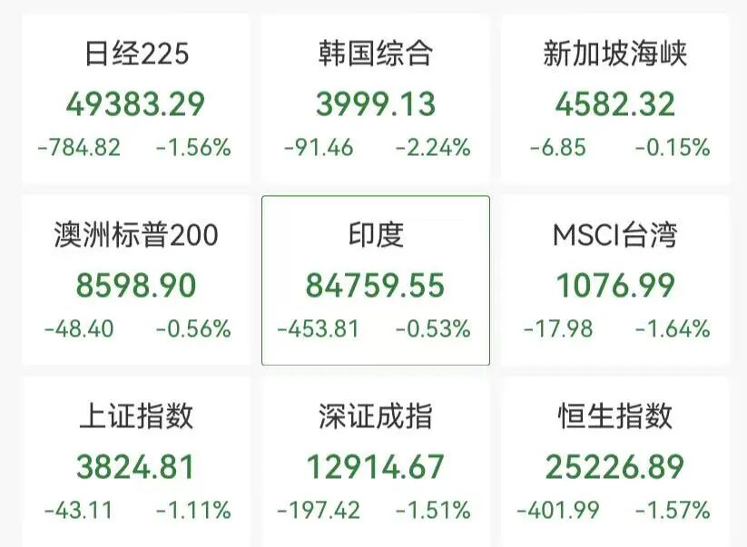 12月16日,亚太主要股指延续跌势,日经225指数收跌超1%,韩国KOSPI指数收跌超2%,A股三大指数集体飘绿,港股午后跌幅进一步扩大;黄金白银盘中跳水,现货铂金逆势飘红。