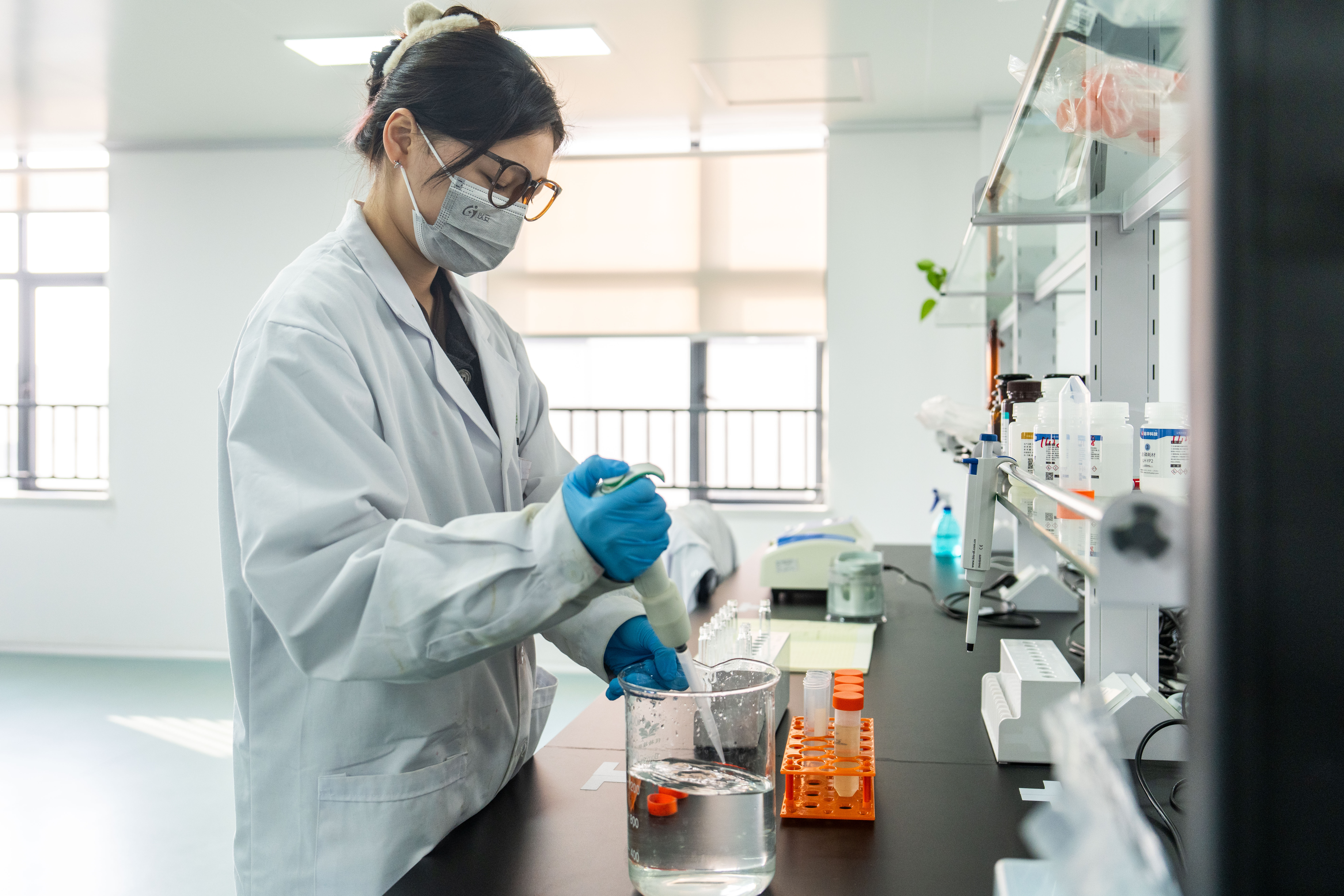 12月1日,在津市高新区的湖南慕恩生物科技有限公司微生物实验室,实验人员检测送检样品成分。新华社记者 陈思汗 摄