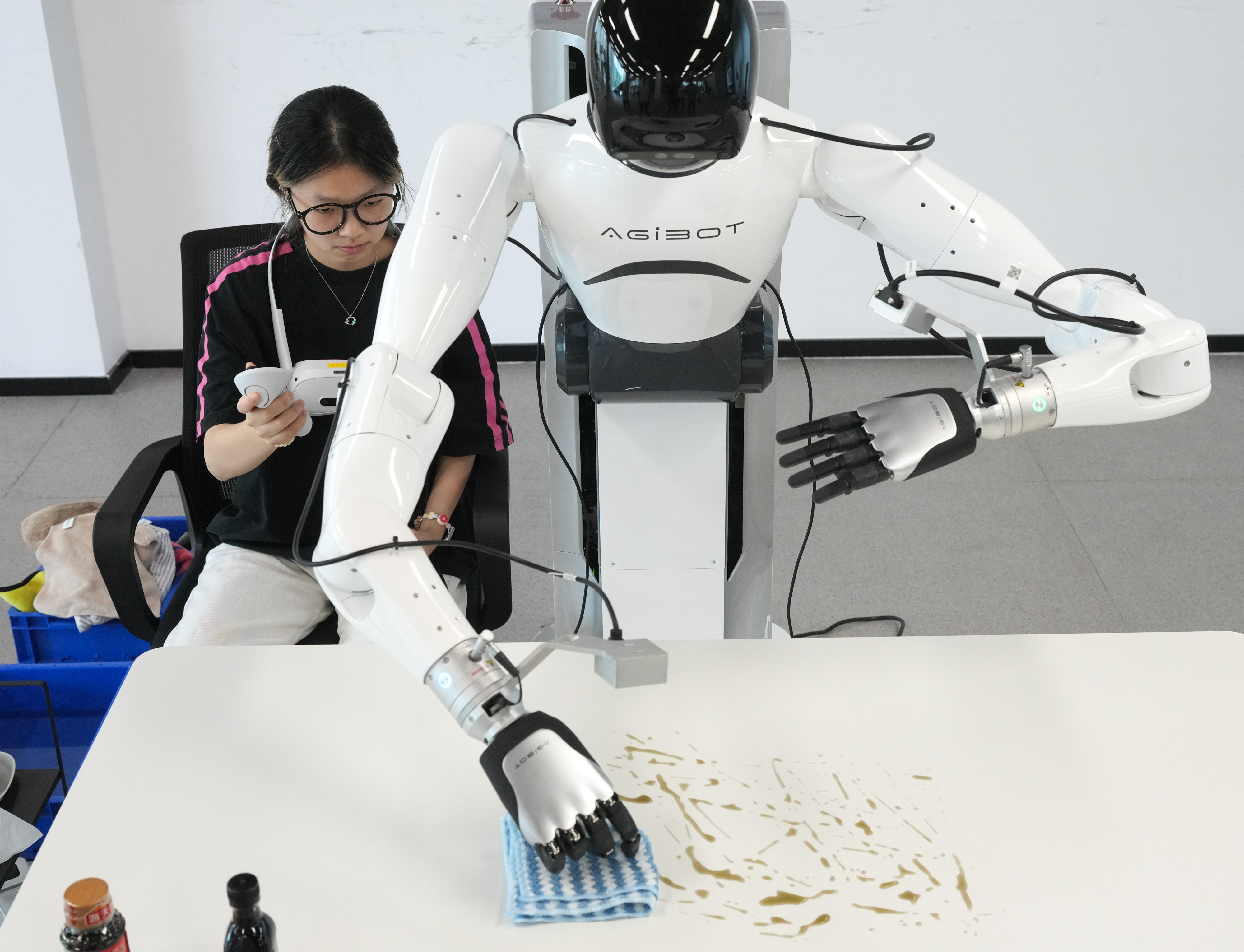 9月23日,工作人员操作机器人进行擦除厨房油污作业的数据采集。新华社记者 翁忻旸 摄