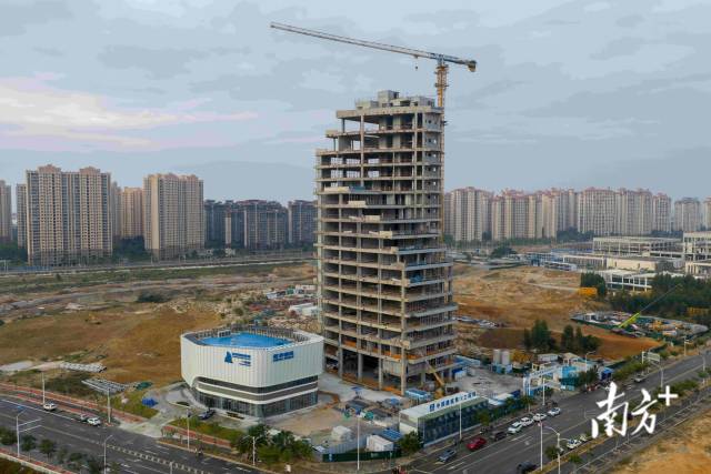 不远处,仍在建设的海南中心尤为醒目,这栋“海南第一高楼”完工后将高达420多米。