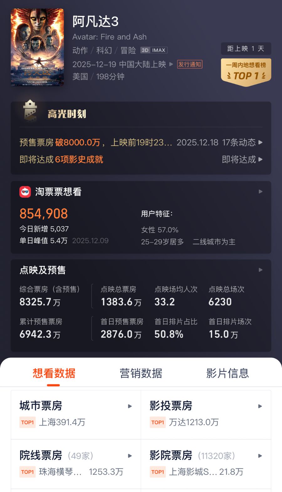灯塔专业版数据显示,截至12月18日13时,该片预售票房(含点映)已突破8000万元。其中首日排片占比达50.8%,预售票房超2800万元,成为过去五年贺岁档科幻片首日票房第二名。