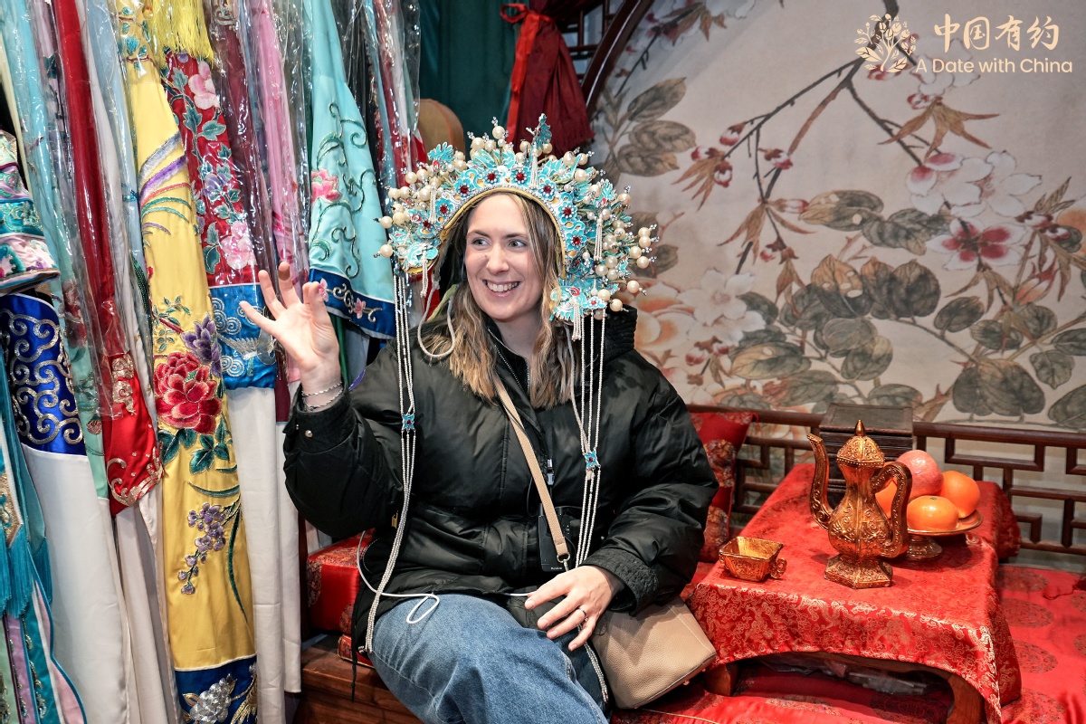 外籍友人体验戏曲凤冠。
