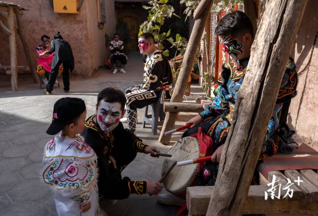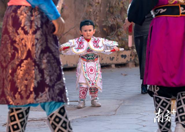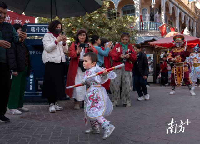 10月31日,在新疆喀什古城,“粤喀情”古城英歌舞队在演出前排练,两岁半的艾福冉兴冲冲地拿起木槌和队员“对舞”。